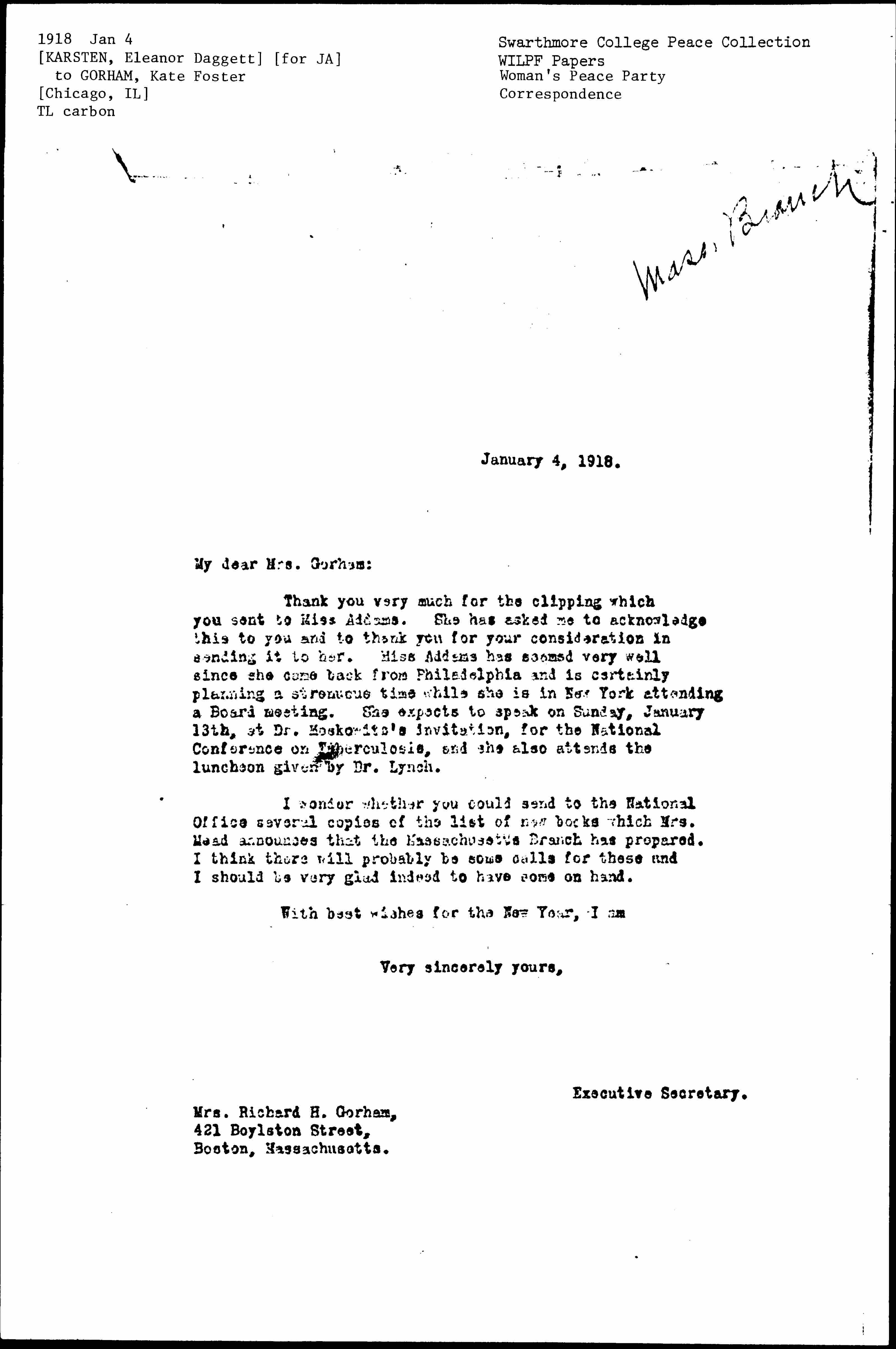 Thank you very much for the clipping which you sent to Miss Addams. She has asked me to acknowledge this to you and to thank you for your consideration in sending it to her. Miss Addams has seemed very well since she came back from Philadelphia and is certainly planning a strenuous time while she is in New York attending a Board meeting. She expects to speak on Sunday, January 13th, at Dr. Moskowitz's invitation, for the National Conference on Tuberculosis, and she also attends the luncheon given by Dr. Lynch.