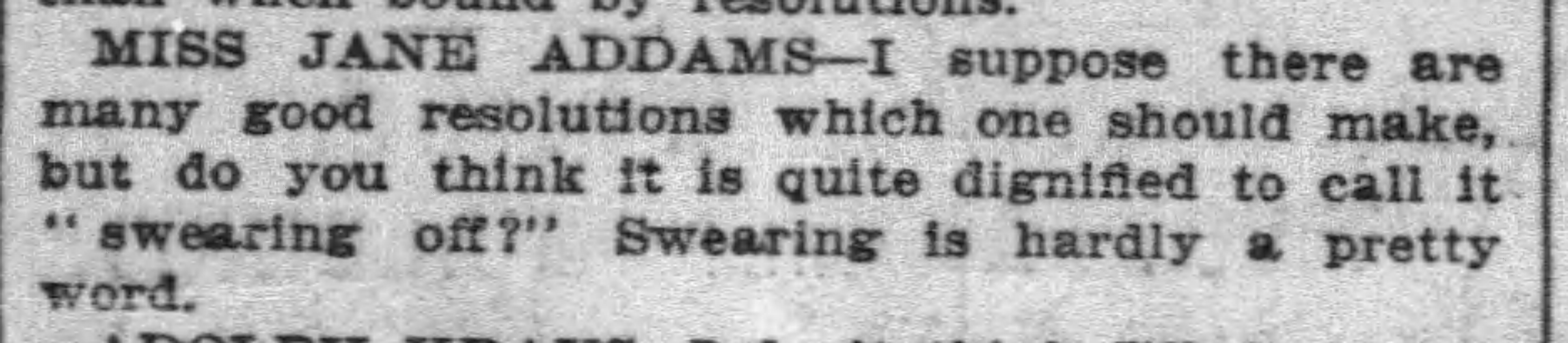 MISS JANE ADDAMS -- I suppose there are many good resolutions which one should make, but do you really think it is quite dignified to call it "swearing off?" Swearing is hardly a pretty word.