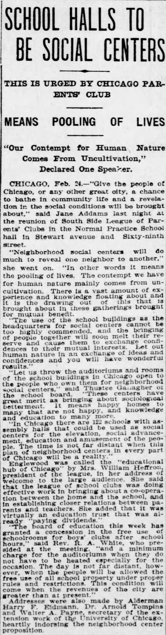 "Let us throw the auditoriums and rooms of the school buildings in Chicago open to the people who own them for neighborhood social centers," said [Trustee] Gallagher of the school board. "These centers have great merit as bringing about sociological betterment. It means happy homes to many that are not happy, and knowledge and education to many more.