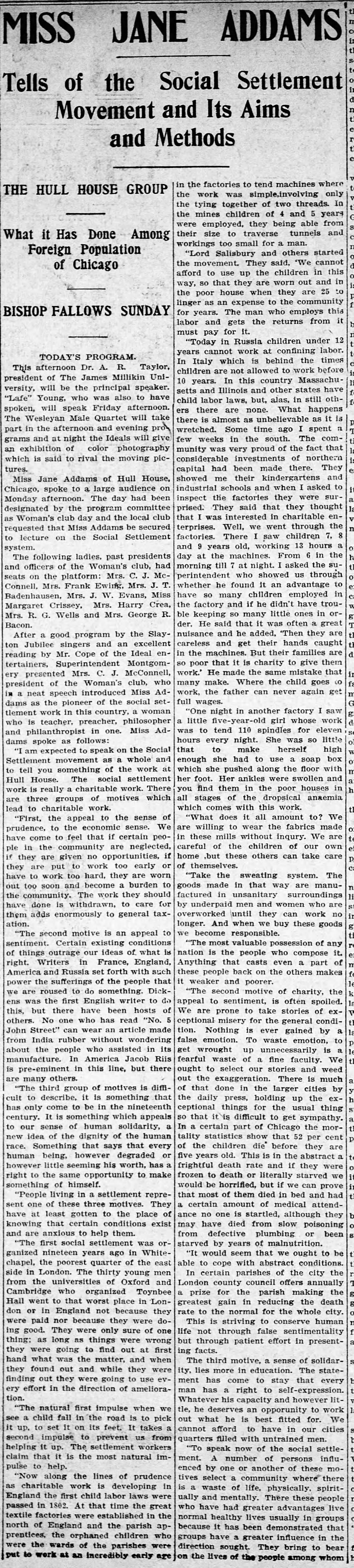 Miss Jane Addams of Hull House, Chicago, spoke to a large audience on Monday afternoon. The day had been designated by the program committee as Woman's club day and the local club requested that Miss Addams be secured to lecture on the Social Settlement system.
