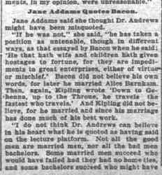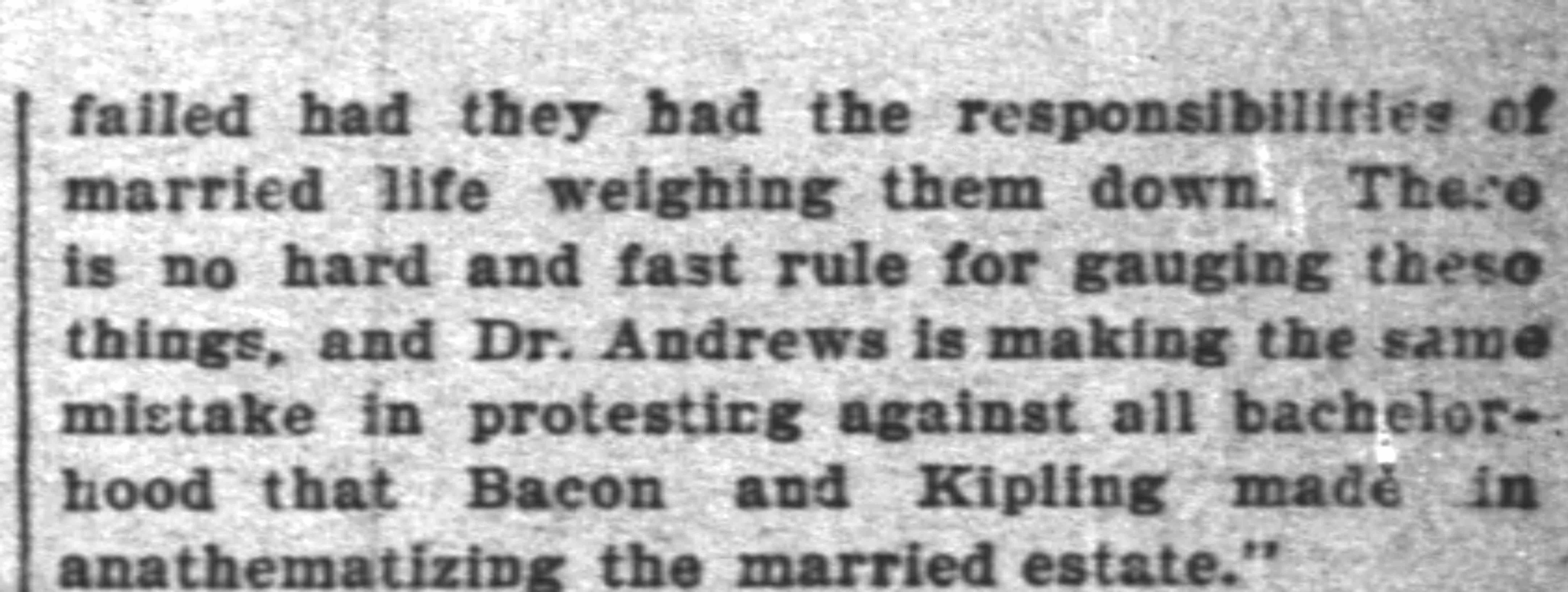 "I do not think Dr. Andrews can believe in his heart what he is quoted as having said on the lecture platform. Not all the good men are married men, nor all the bad men bachelors. Some married men succeed who would have failed had they had no home ties, and some bachelors succeed who might have [page 2] failed had they had the responsibilities of married life weighing them down. There is no hard and fast rule for gauging these things, and Dr. Andrews is making the same mistake in protesting against all bachelorhood that Bacon and Kipling made in anathematizing the married estate."