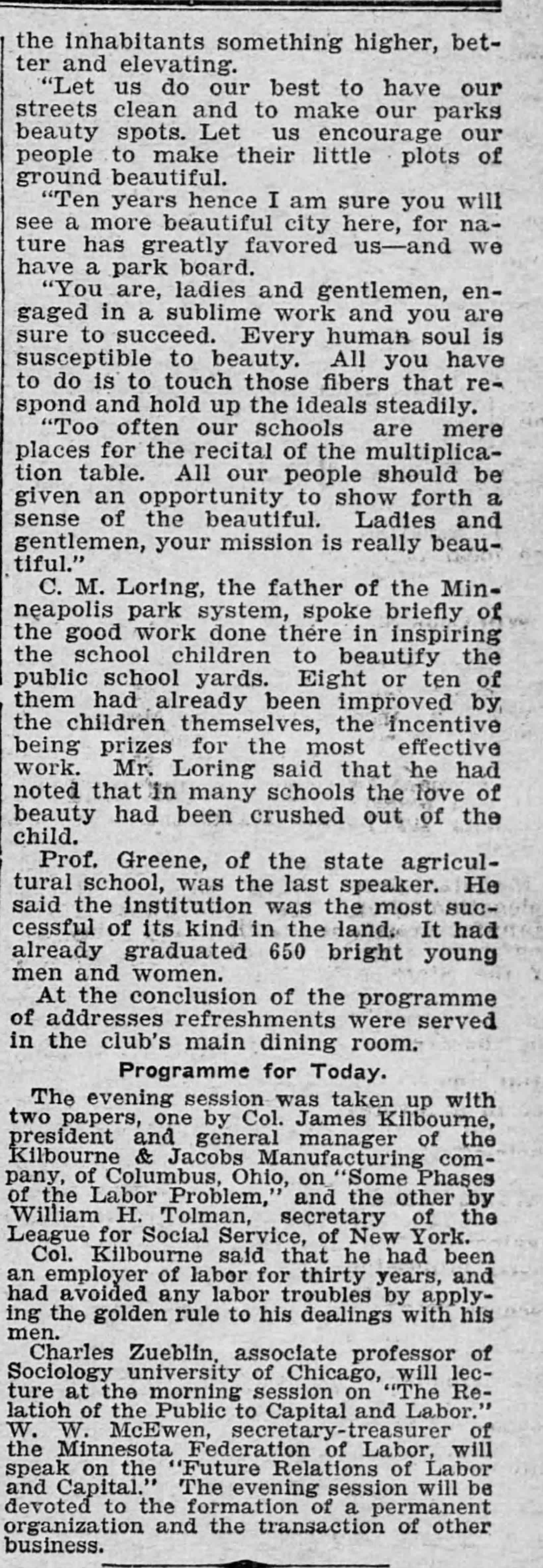 C. M. Loring, the father of the Minneapolis park system, spoke briefly of the good work done there in inspiring the school children to beautify the public school yards. Eight or ten of them had already been improved by the children themselves, the incentive being prizes for the most effective work. Mr. Loring said that he had noted that in many schools the love of beauty had been crushed out of the child.