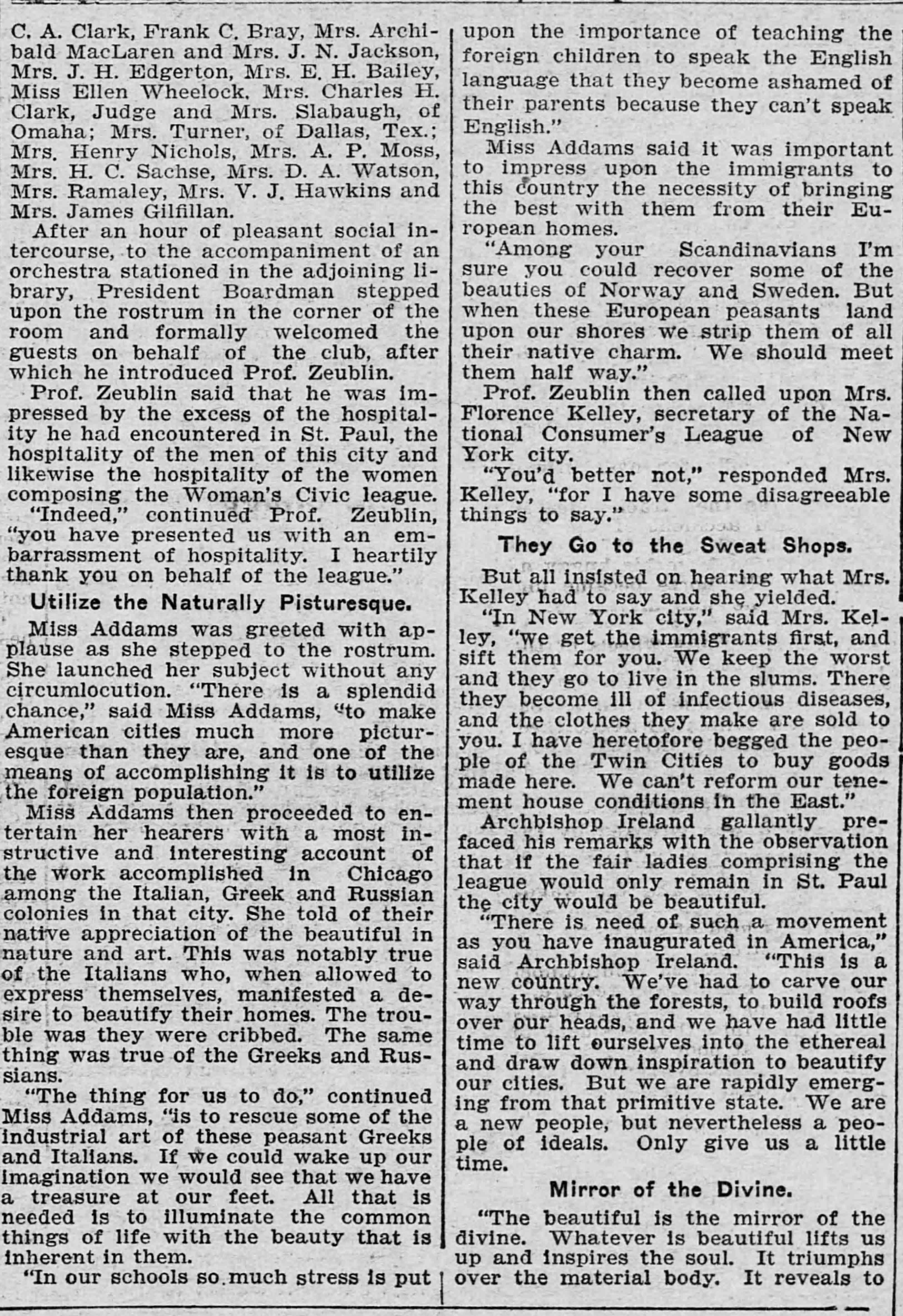 Miss Addams was greeted with applause as she stepped to the rostrum. She launched her subject without any circumlocution. "There is a splendid chance," said Miss Addams, "to make American cities much more picturesque than they are, and one of the means of accomplishing it is to utilize the foreign population."