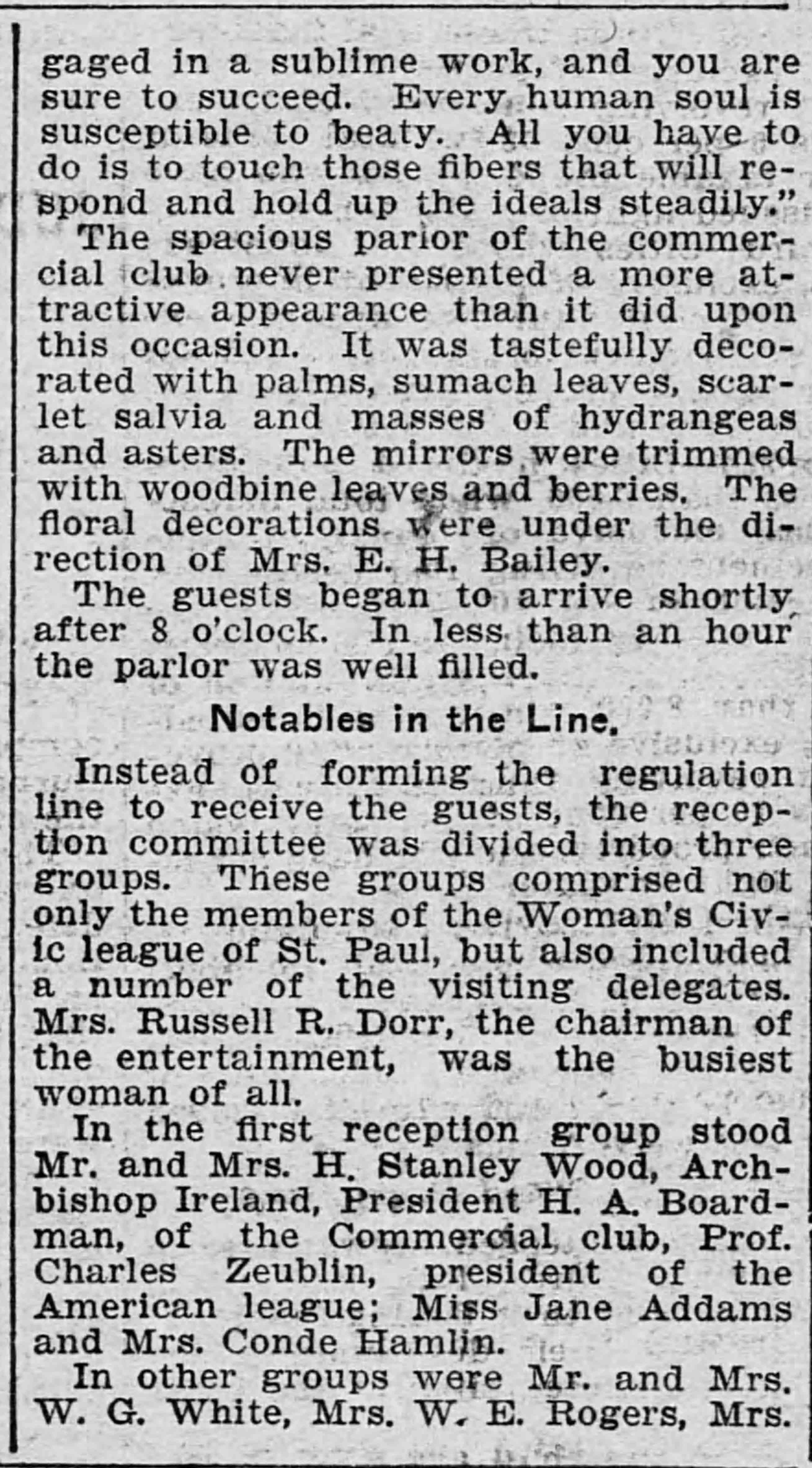 In the first reception group stood Mr. and Mrs. H. Stanley Wood, Archbishop Ireland, President H. A. Boardman, of the Commercial club, Prof. Charles [Zueblin], president of the American league; Miss Jane Addams and Mrs. Conde Hamlin.