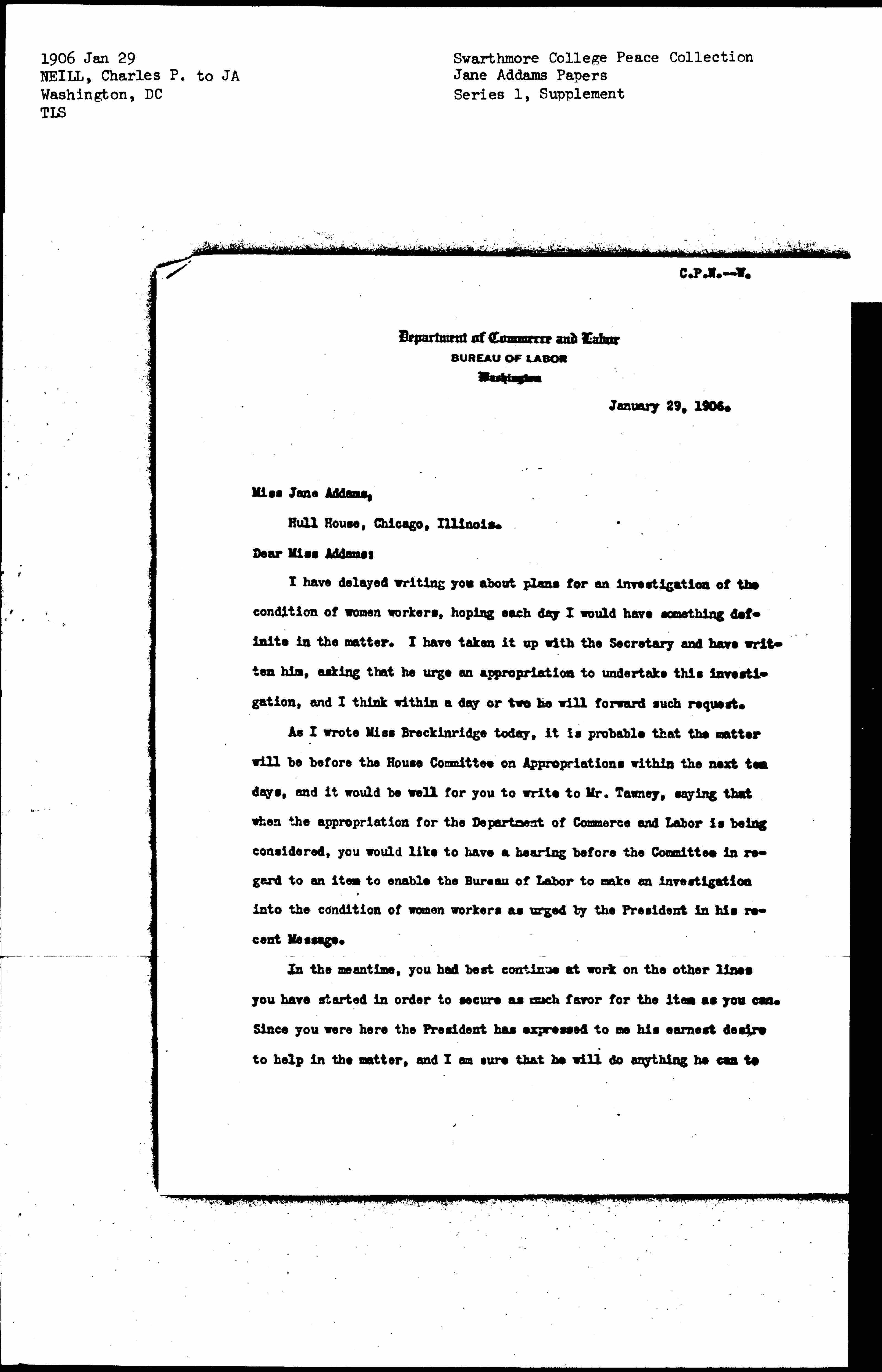 As I wrote Miss Breckinridge today, it is probable that the matter will be before the House Committee on Appropriations within the next ten days, and it would be well for you to write to Mr. Tawney, saying that when the appropriation for the Department of Commerce and Labor is being considered, you would like to have a hearing before the Committee in regard to an item to enable the Bureau of Labor to make an investigation into the condition of women workers as urged by the President in his recent Message.