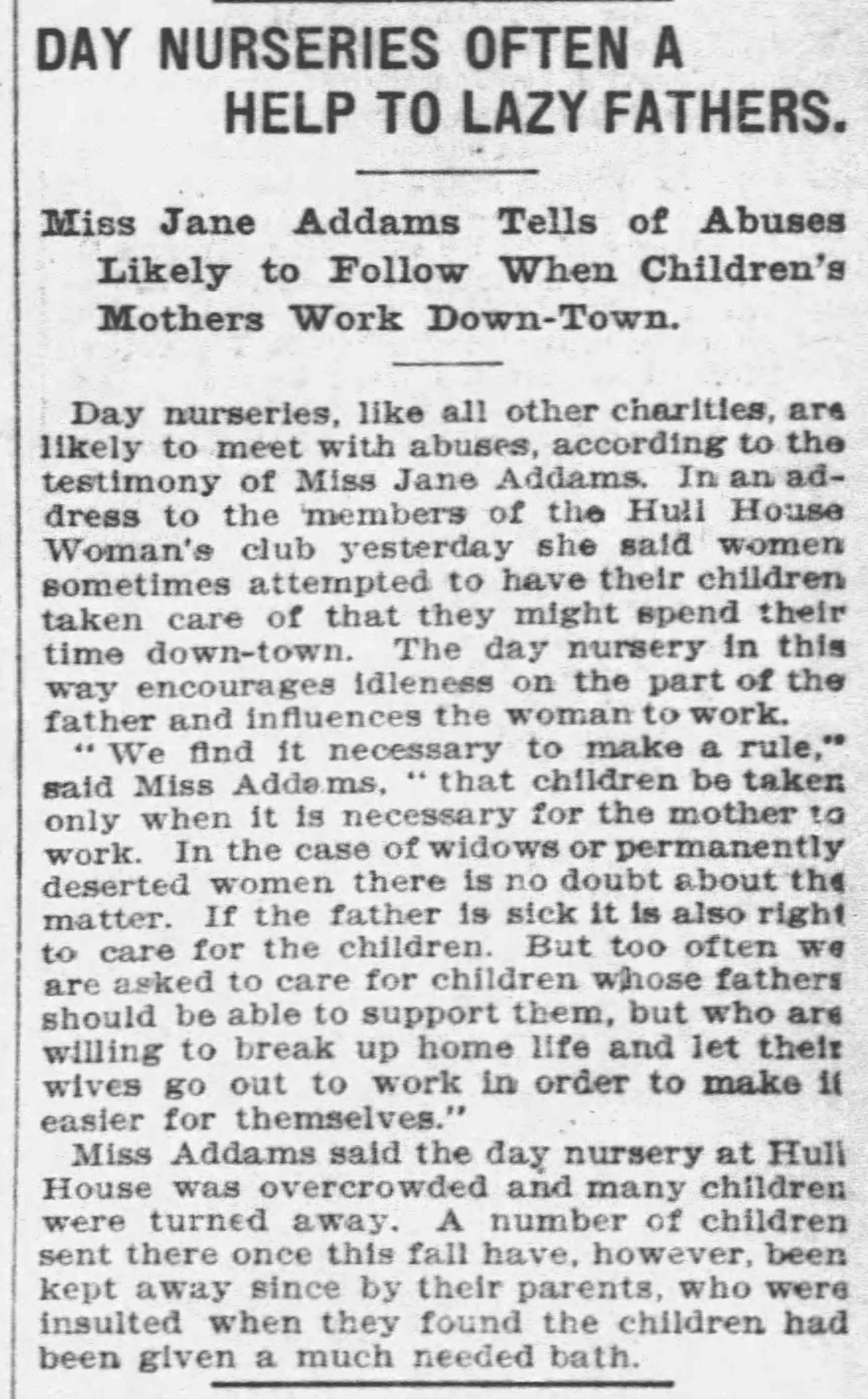 "We find it necessary to make a rule," said Miss Addams, "that children be taken only when it is necessary for the mother to work. In the case of widows or permanently deserted women there is no doubt about the matter. If the father is sick it is also right to care for the children. But too often we are asked to care for children whose fathers should be able to support them, but who are willing to break up home life and let their wives go out to work in order to make it easier for themselves."