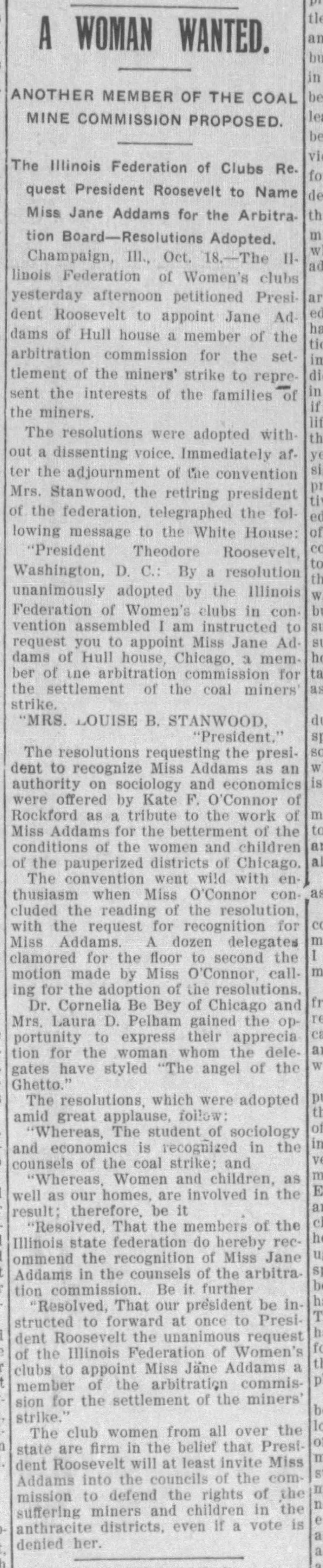 "Resolved, That our president be instructed to forward at once to President Roosevelt the unanimous request of the Illinois Federation of Women's Clubs to appoint Miss Jane Addams a member of the arbitration commission for the settlement of the miners' strike."