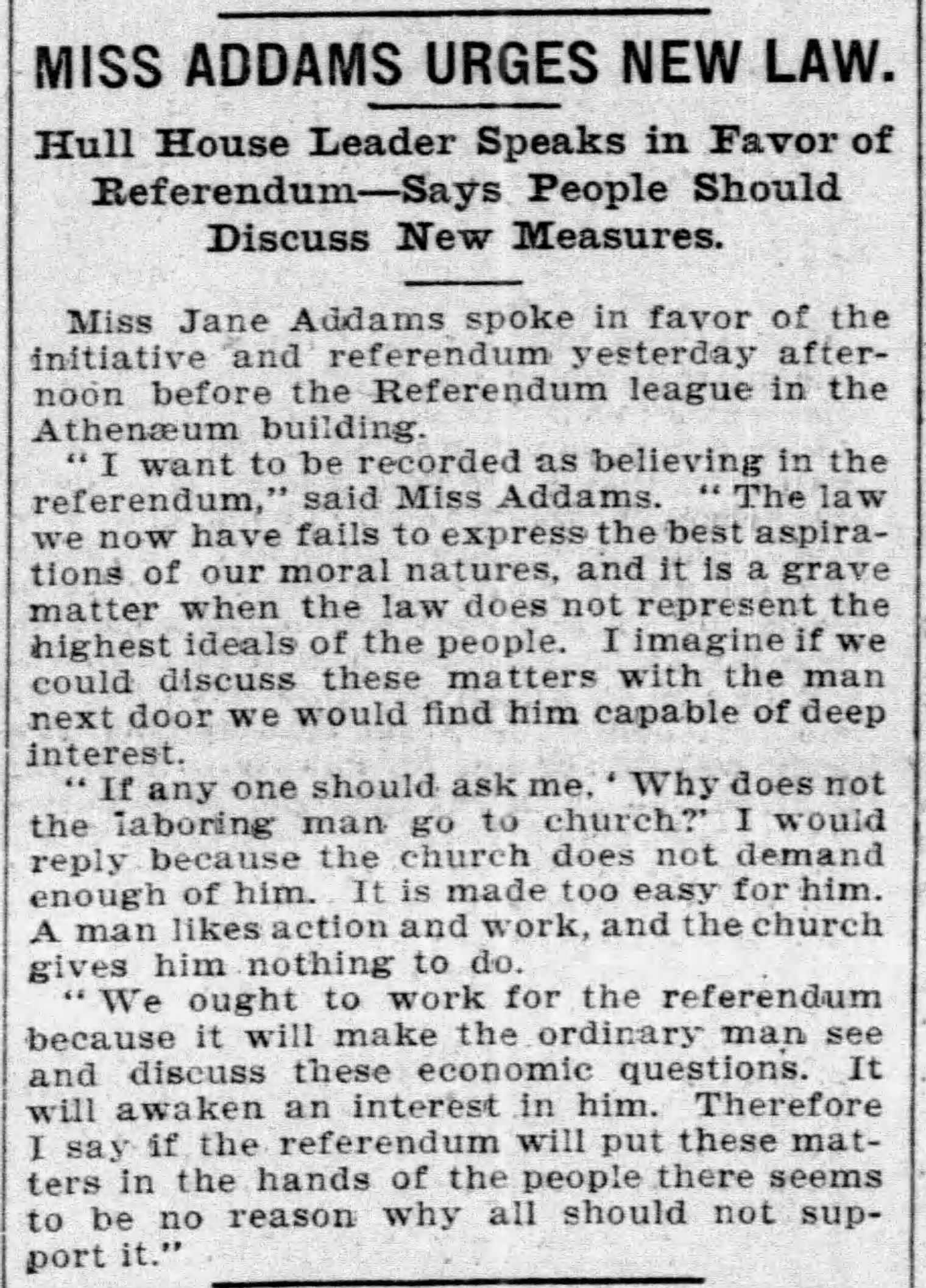 "I want to be recorded as believing in the referendum," said Miss Addams. "The law we now have fails to express the best aspirations of our moral natures, and it is a grave matter when the law does not represent the highest ideals of the people. I imagine if we could discuss these matters with the man next door we would find him capable of deep interest.