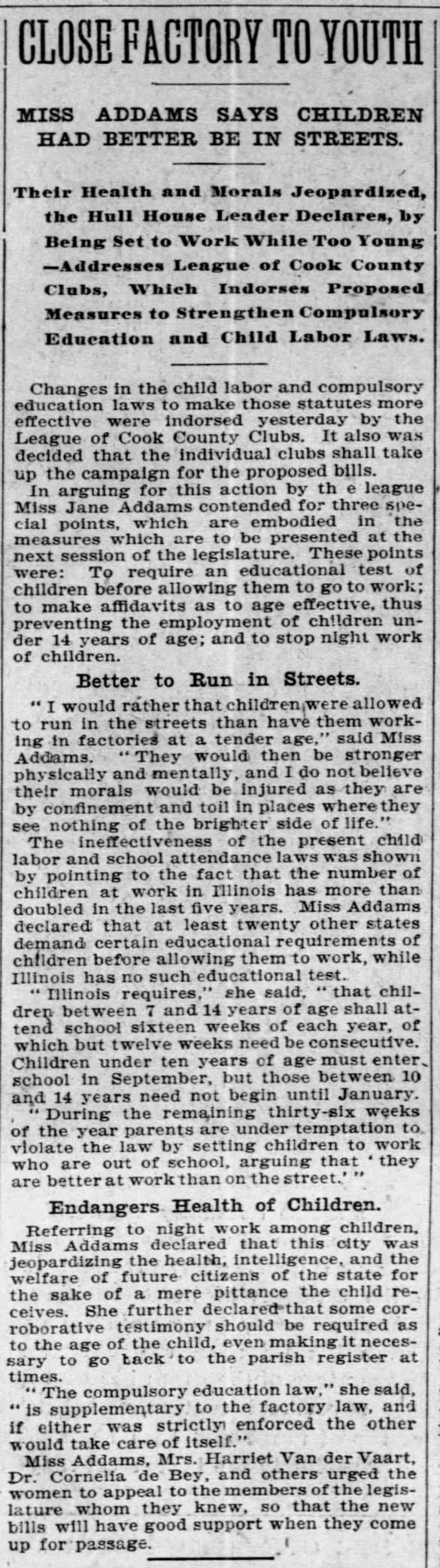 "I would rather that children were allowed to run in the streets than have them working in factories at a tender age," said Miss Addams. "They would then be stronger physically and mentally, and I do not believe their morals would be injured as they are by confinement and toil in places where they see nothing of the brighter side of life."