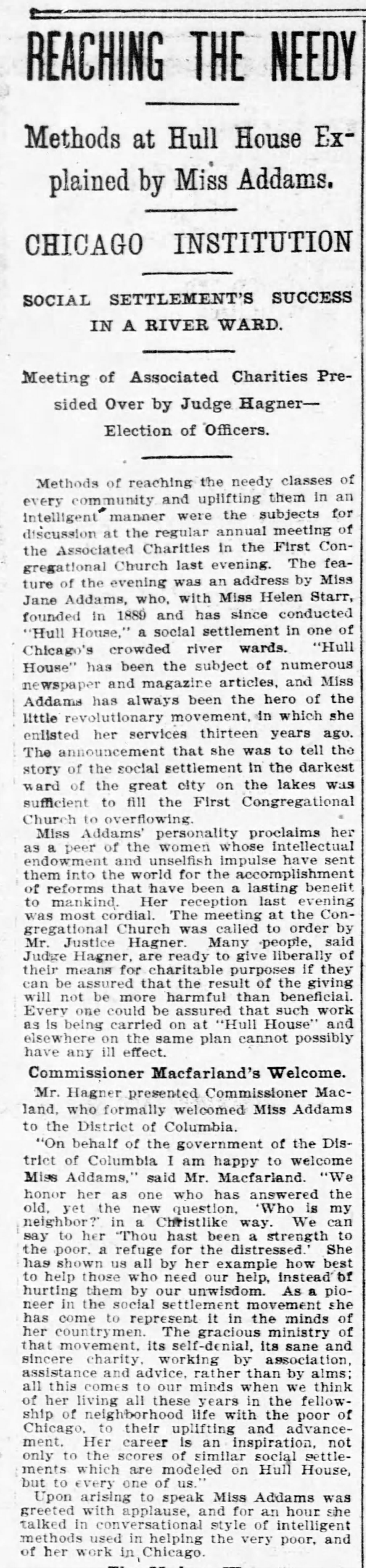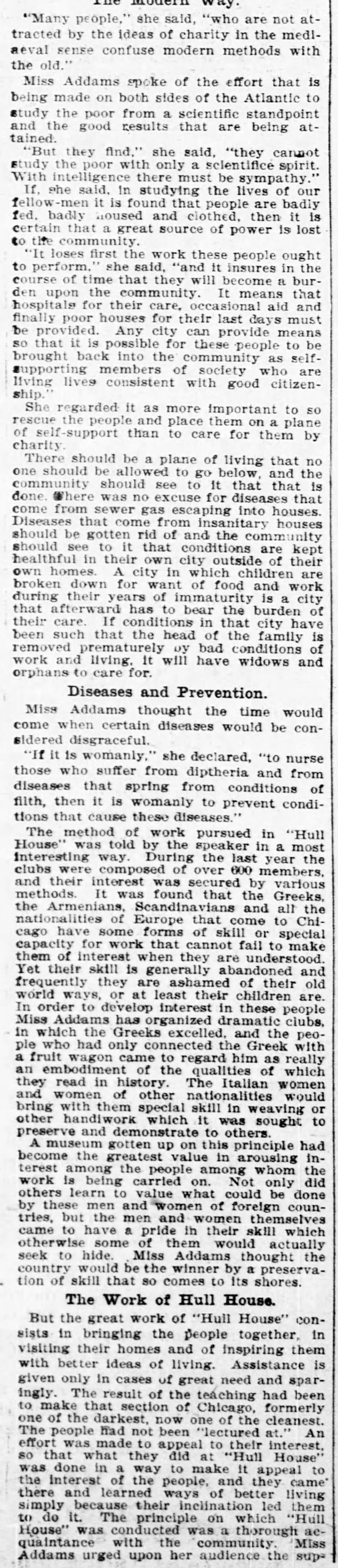 Upon arising to speak Miss Addams was greeted with applause, and for an hour she talked in conversational style of intelligent methods used in helping the very poor, and of her work in Chicago. [page 2]