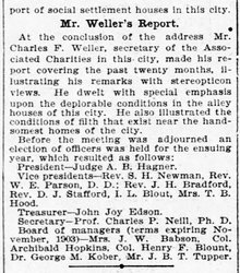 At the conclusion of the address Mr. Charles F. Weller, secretary of the Associated Charities in this city, made his report covering the past twenty months, illustrating his remarks with stereopticon views. He dwelt with special emphasis upon the deplorable conditions in the alley houses of this city. He also illustrated the conditions of filth that exist near the handsomest homes of the city.
