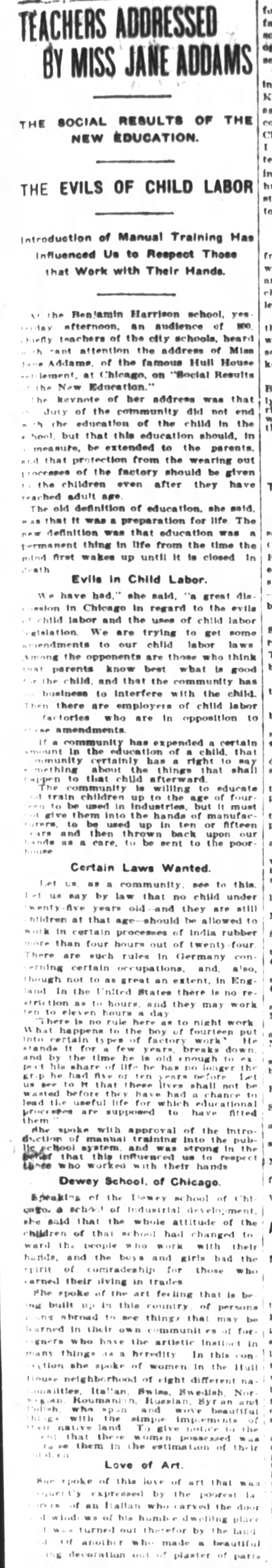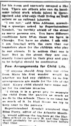 "I am not," said Miss Addams, answering a question asked by Superintendent Kendall, "so terribly afraid of the street as many persons are. You have different conditions here from those we have in Chicago. You have no slums, I am told. I am touched with the care that our teamsters show for the children who play in our streets. It is seldom that one us hurt. But in the street they are constantly interrupted in their play and play to be helpful should be continuous."