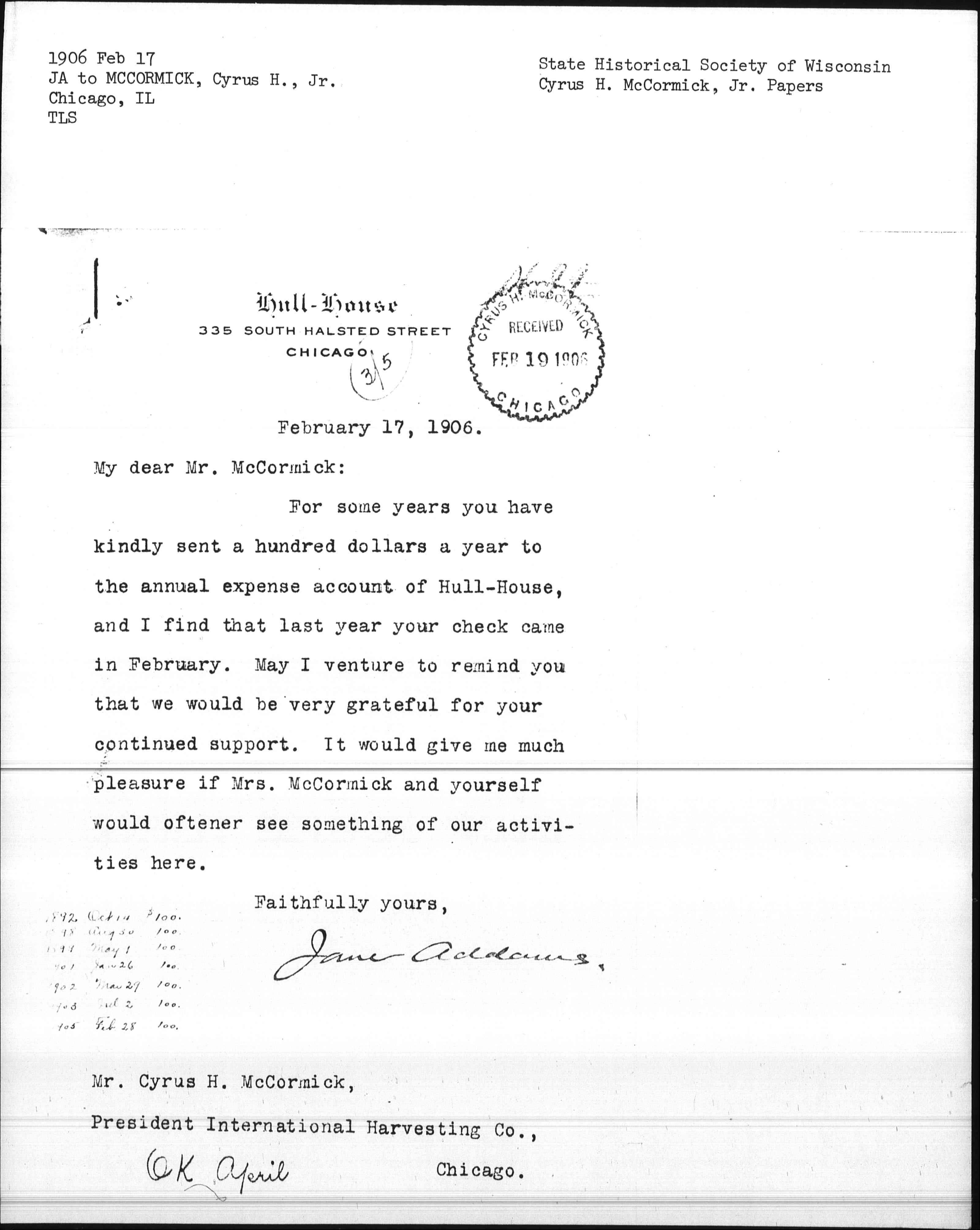 For some years you have kindly sent a hundred dollars a year to the annual expense account of Hull-House, and I find that last year your check came in February. May I venture to remind you that we would be very grateful for your continued suport. It would give me much pleasure if Mrs. McCormick and yourself would oftener see someting of out activities here.