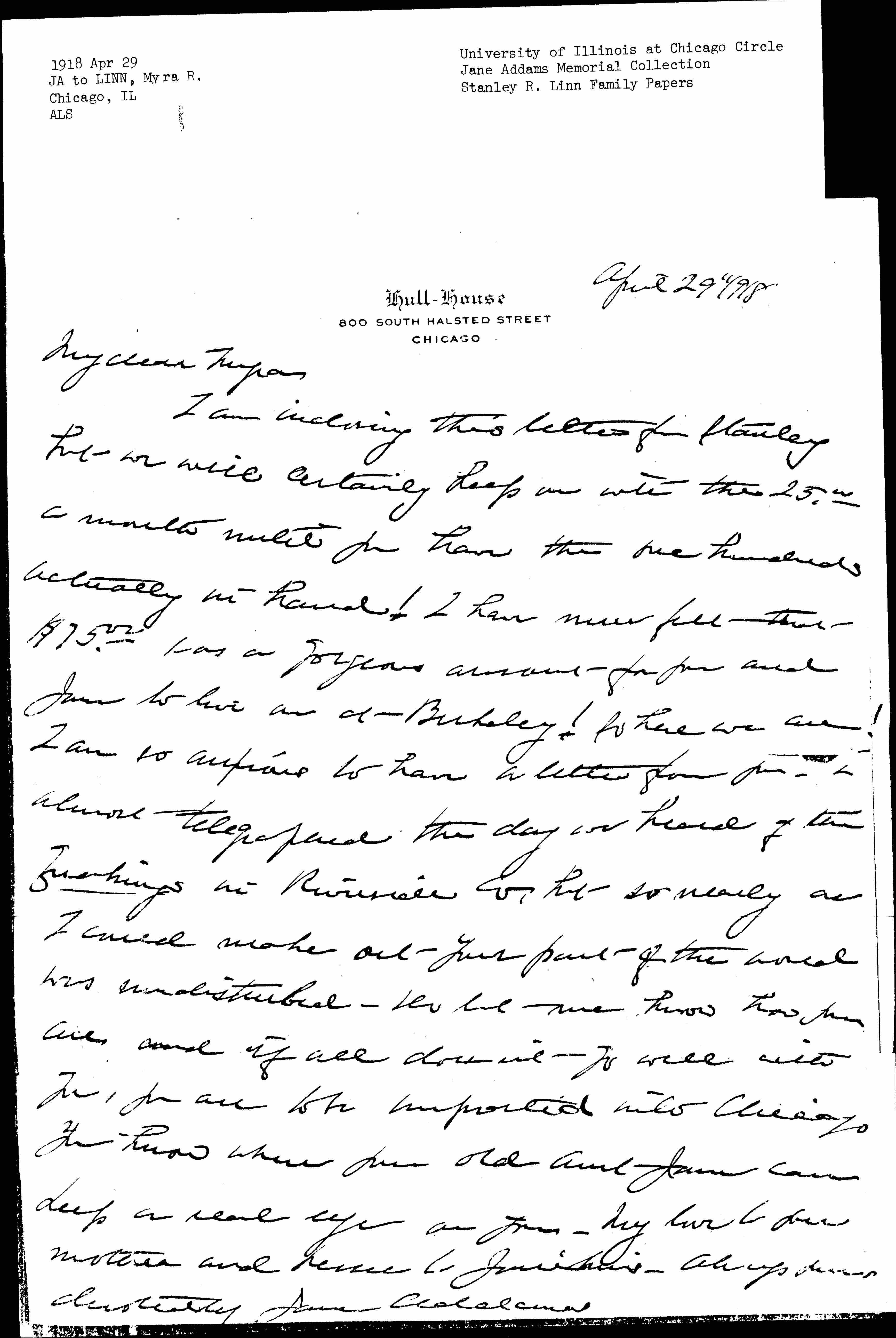 I am [enclosing] this letter from Stanley but we will certainly keep on with the 25.00 a month until you have the one hundred actually in hand! I have never felt that $75.00 was a gorgeous amount for you and Jane to live on at Berkeley! So here we are! I am so anxious to have a letter from you. I almost telegraphed the day we heard of the quakings in Riverside Co, but so nearly as I could make out your part of the world was undisturbed. Do let me know how you are and if all doesn't go well with you, you are to be imported into Chicago you know where your old Aunt Jane can keep a real eye on you. My love to your mother and kisses to Janikins. Always yours devotedly Jane Addams