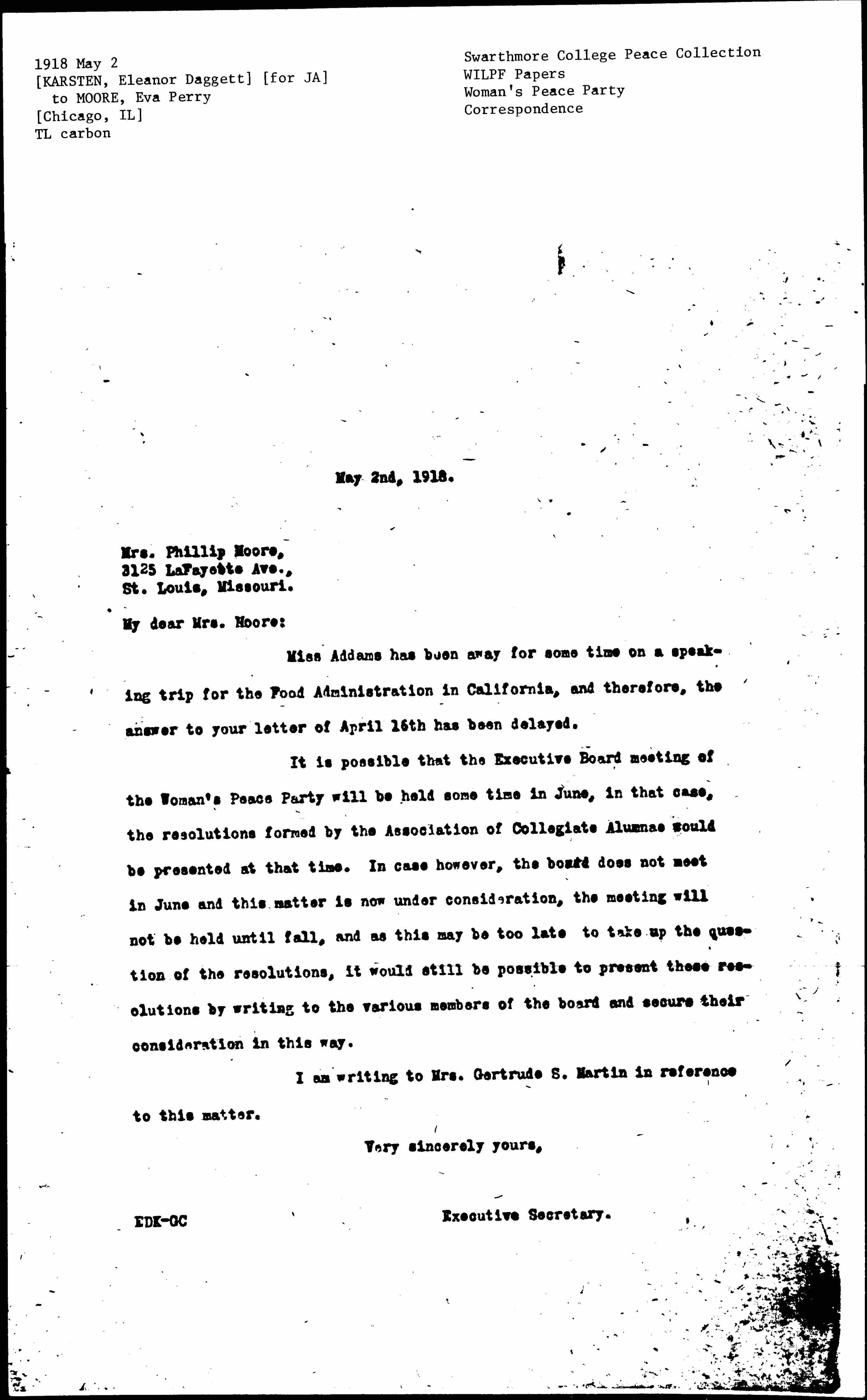 It is possible that the Executive Board meeting of the Woman's Peace Party will be held some time in June, in that case, the resolutions formed by the Association of Collegiate Alumnae would be presented at that time. In case however, the board does not meet in June and this matter is now under consideration, the meeting will not be held until fall, and as this may be too late to take up the question of the resolutions, it would still be possible to prevent these resolutions by writing to the various members of the board and secure their consideration in this way.