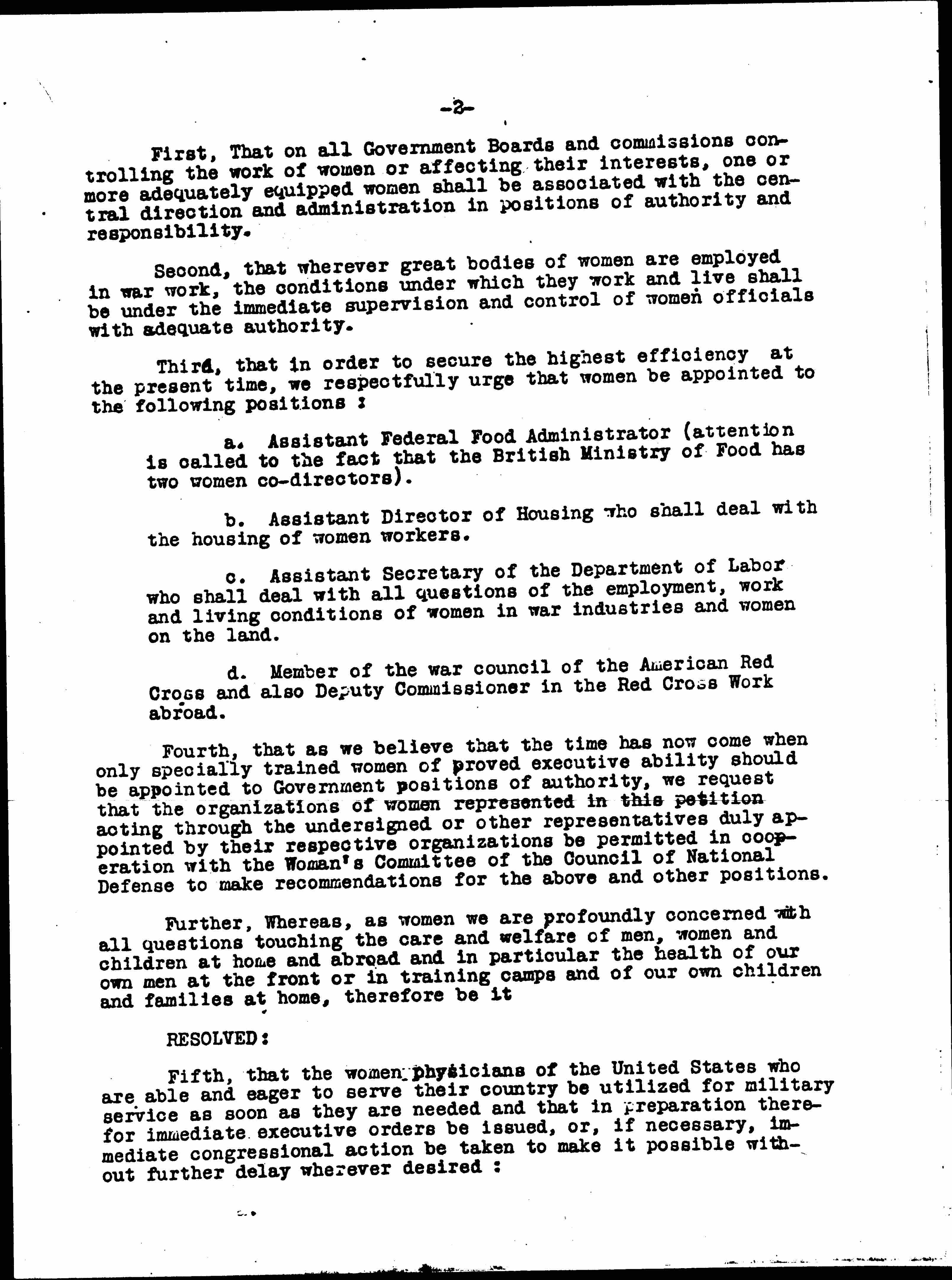 Fourth, that as we believe that the time has now come when only specially trained women of proved executive ability should be appointed to Government positions of authority, we request that the organizations of women represented in this petition acting through the undersigned or other representatives duly appointed by their respective organizations be permitted in cooperation with the Woman's Committee of the Council of National Defense to make recommendations for the above and other positions.