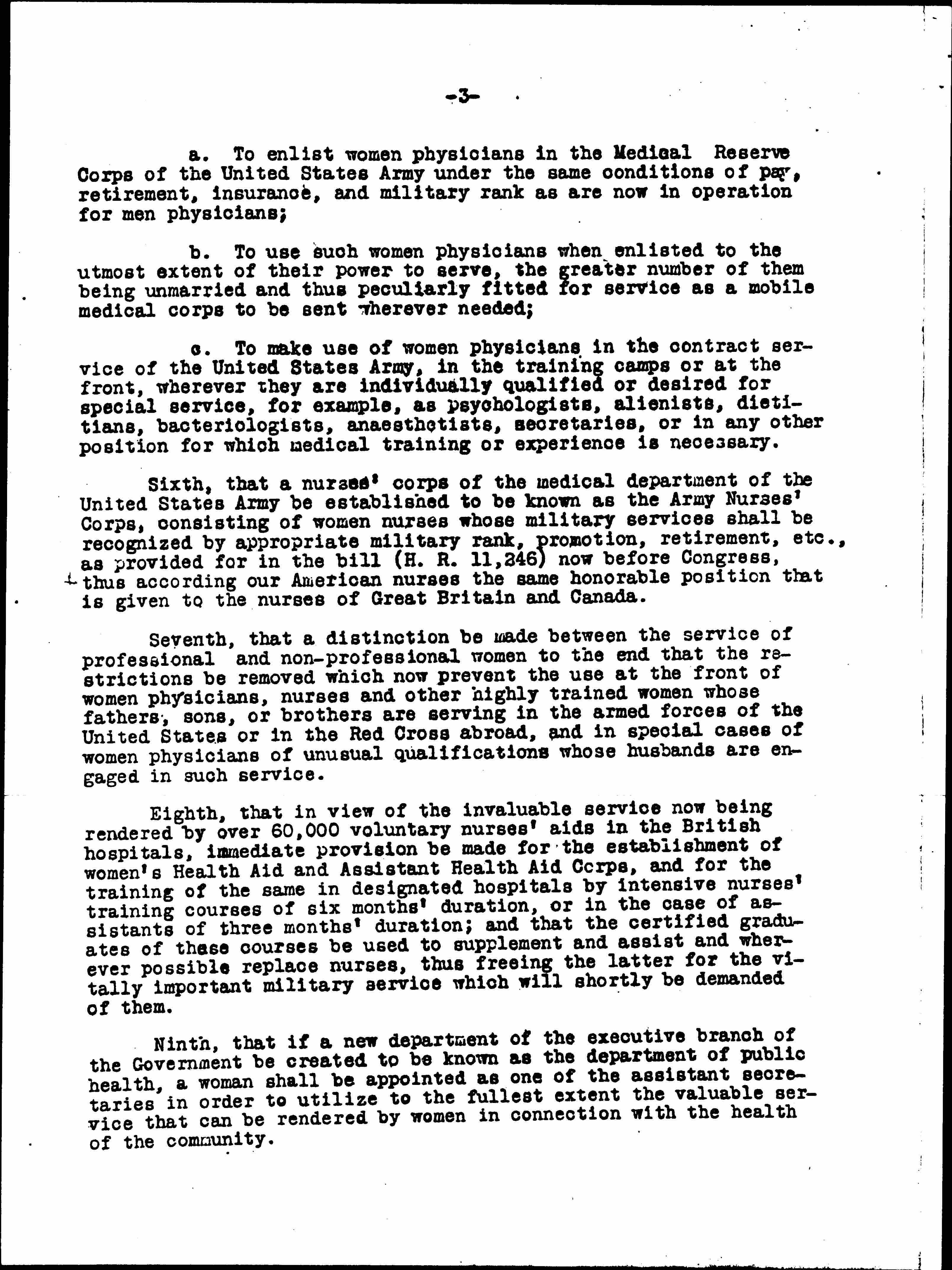 Fifth, that the women physicians of the United States who are able and eager to serve their country be utilized for military service as soon as they are needed and that in preparation therefor immediate executive orders be issued, or, if necessary, immediate congressional action be taken to make it possible without further delay wherever desired: [page 3]