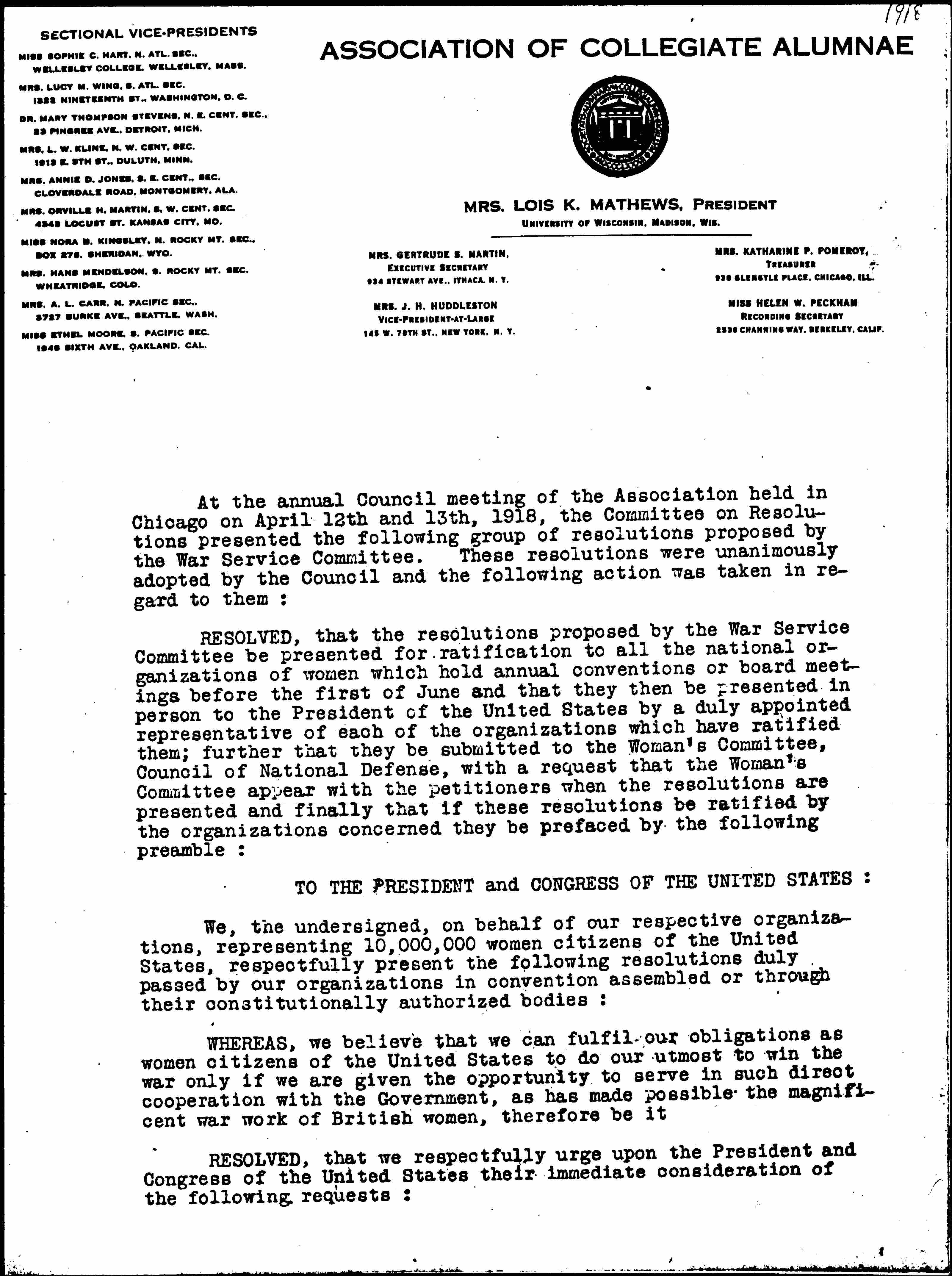 RESOLVED, that the resolutions proposed by the War Service Committee be presented for ratification to all the national organizations of women which hold annual conventions or board meetings before the first of June and that they then be presented in person to the President of the United States by a duly appointed representative of each of the organizations which have ratified them; further that they be submitted to the Woman's Committee, Council of National Defense, with a request that the Woman's Committee appear with the petitioners when the resolutions are presented and finally that if these resolutions be ratified by the organizations concerned they be prefaced by the following preamble: