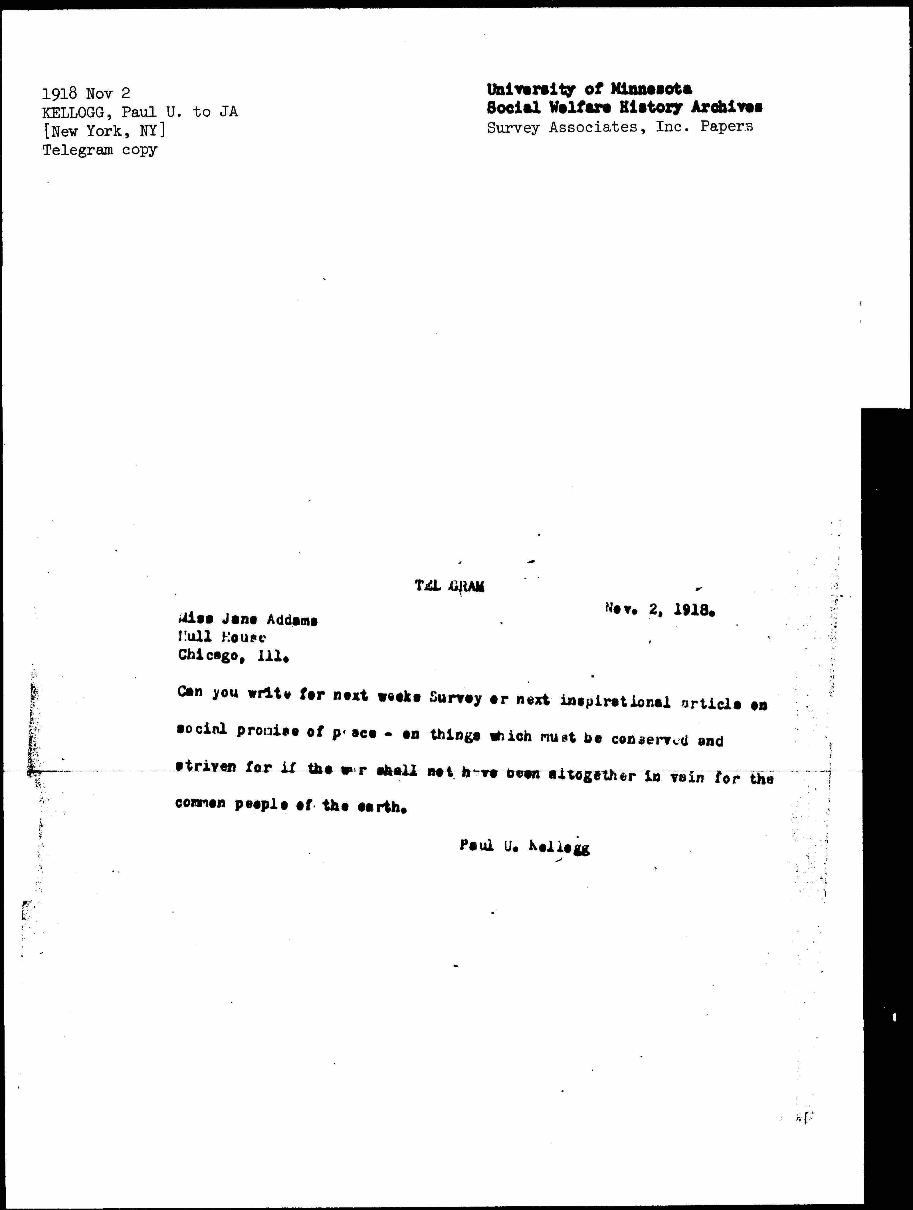 Can you write for next weeks Survey or next inspirational article on social promise of peace -- on things which must be conserved and striven for if the war shall not have been altogether in vain for the common people of the earth.