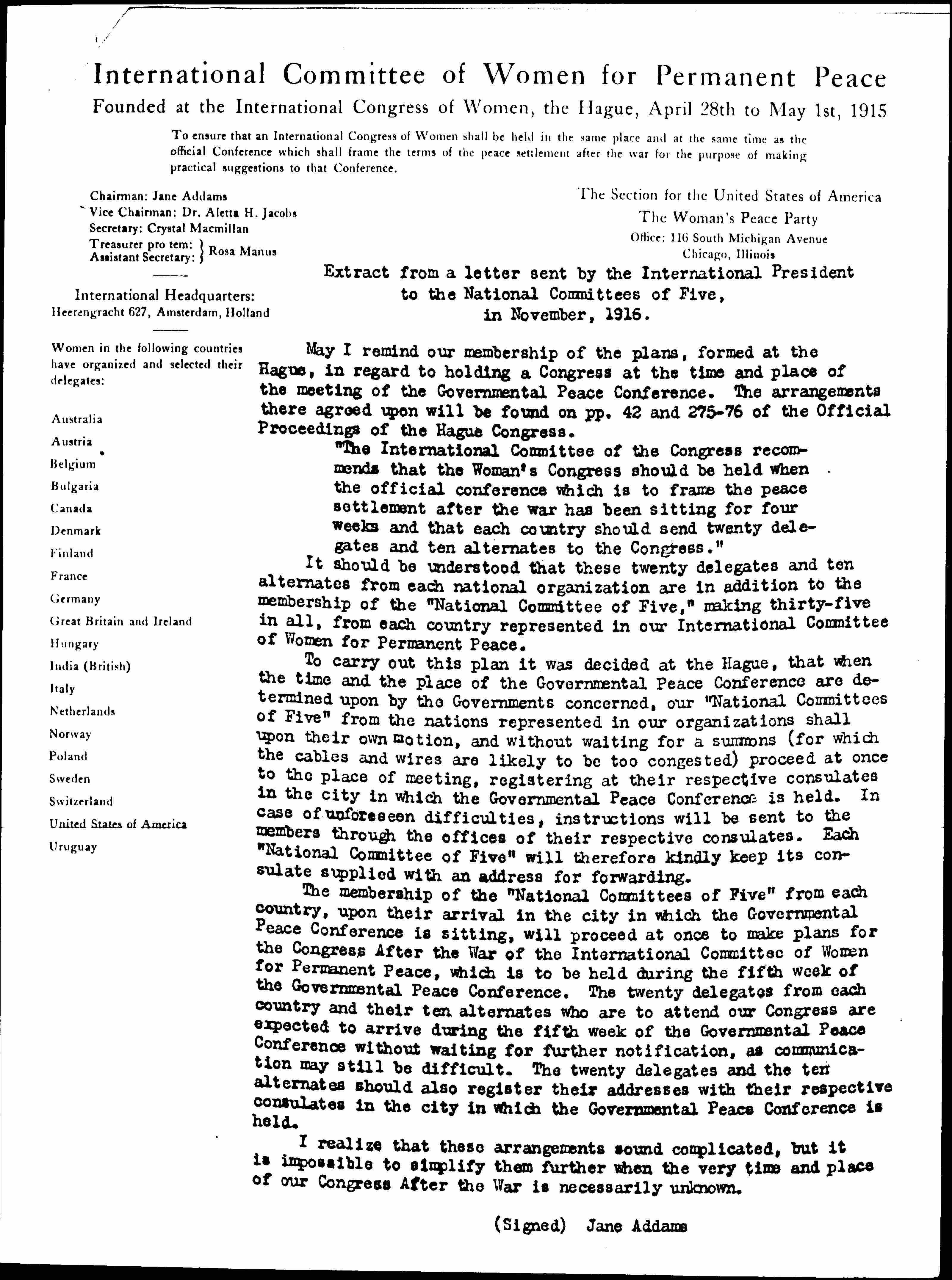 It should be understood that these twenty delegates and ten alternates from each national organization are in addition to the membership of the "National Committee of Five," making thirty-five in all, from each country represented in our International Committee of Women for Permanent Peace.
