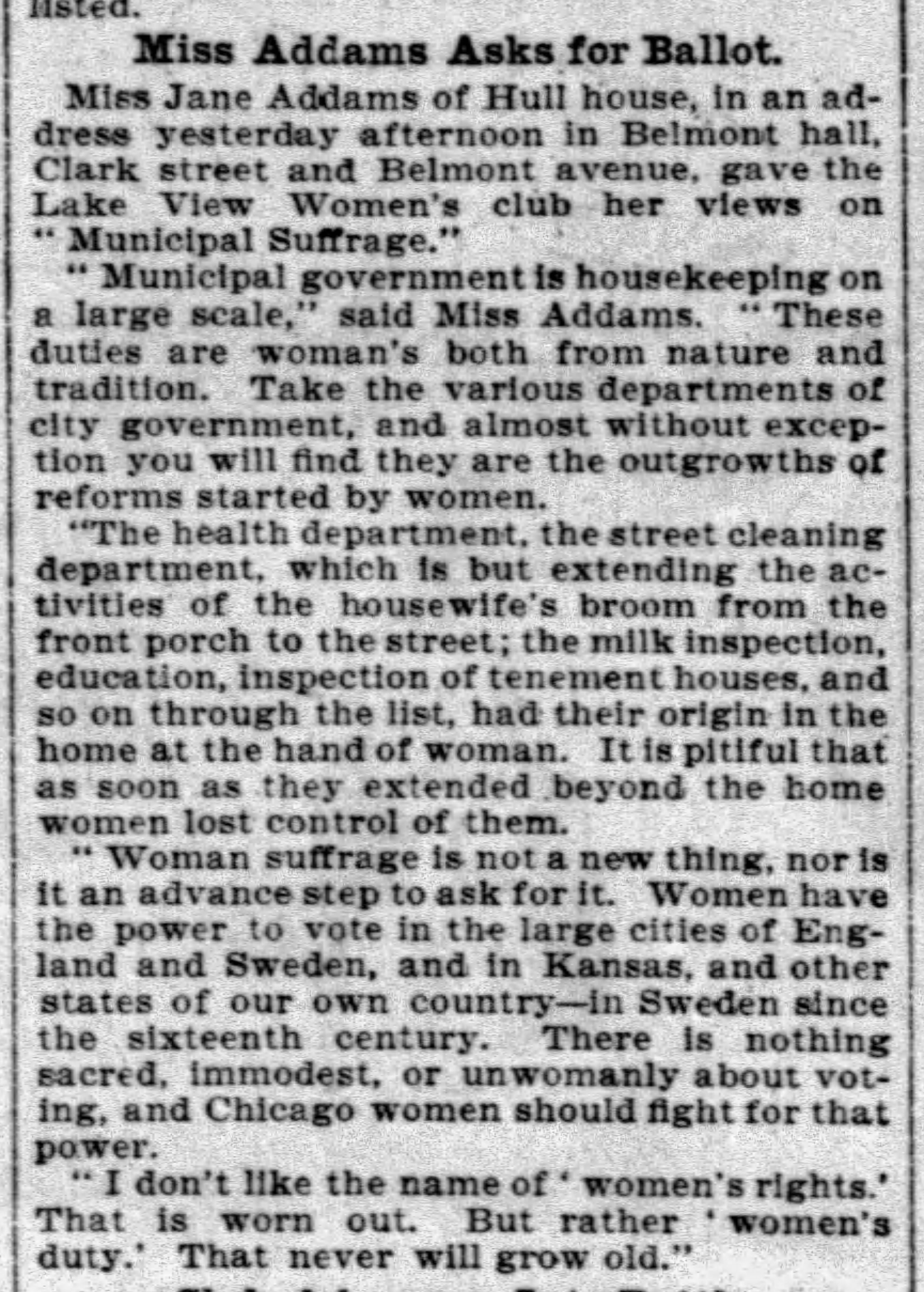 "Woman suffrage is not a new thing, nor is it an advance step to ask for it. Women have the power to vote in the large cities of England and Sweden, and in Kansas, and other states of our own country -- in Sweden since the sixteenth century. There is nothing sacred, immodest, or unwomanly about voting, and Chicago women should fight for that power.