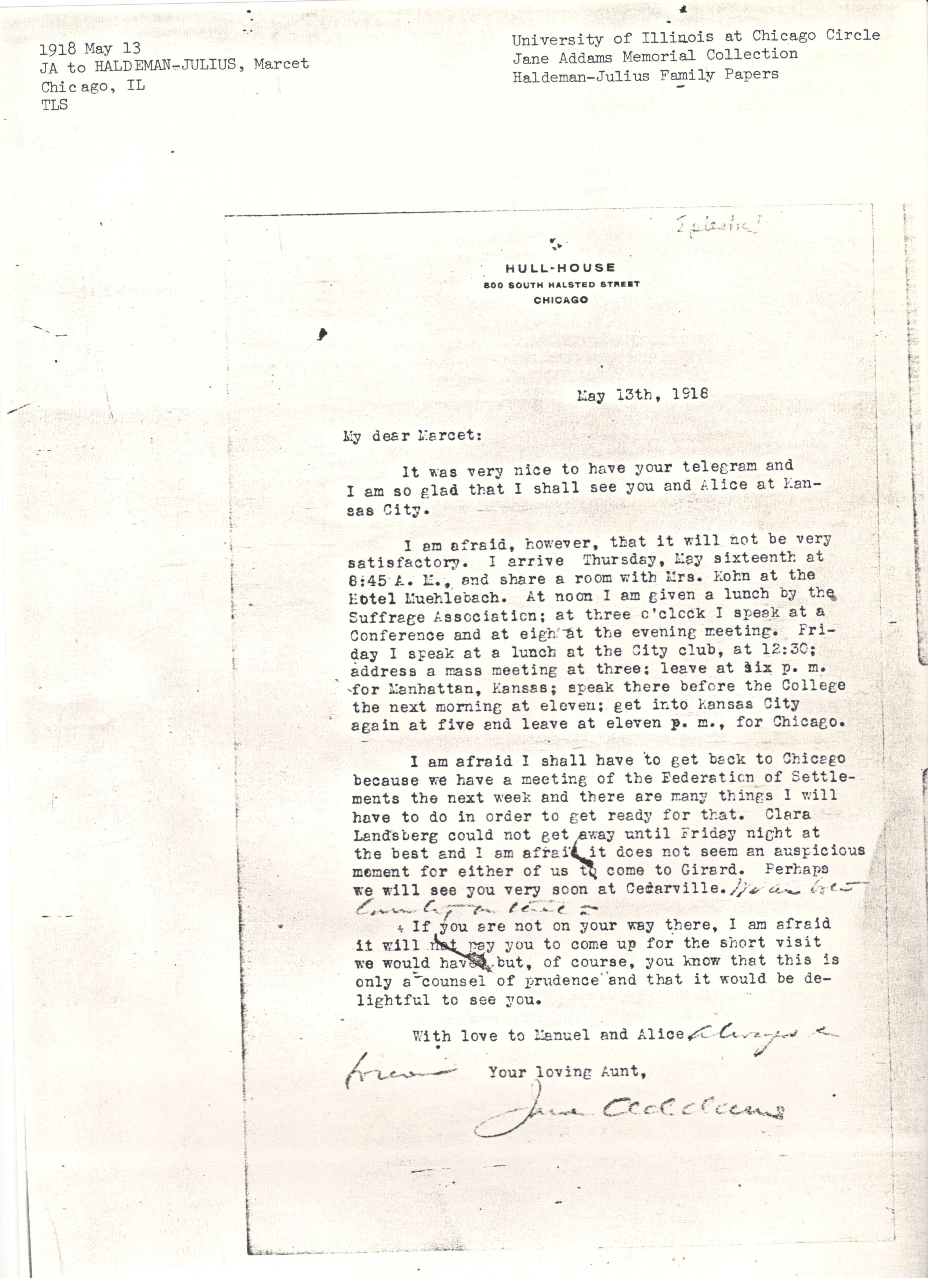 I am afraid I shall have to get back to Chicago because we have a meeting of the Federation of Settlements the next week and there are many things I will have to do in order to get ready for that. Clara Landsberg could not get away until Friday night at the best and I am afraid it does not seem an auspicious moment for either of us to come to Girard. Perhaps we will see you very soon at Cedarville. ↑We are both counting on that.↓