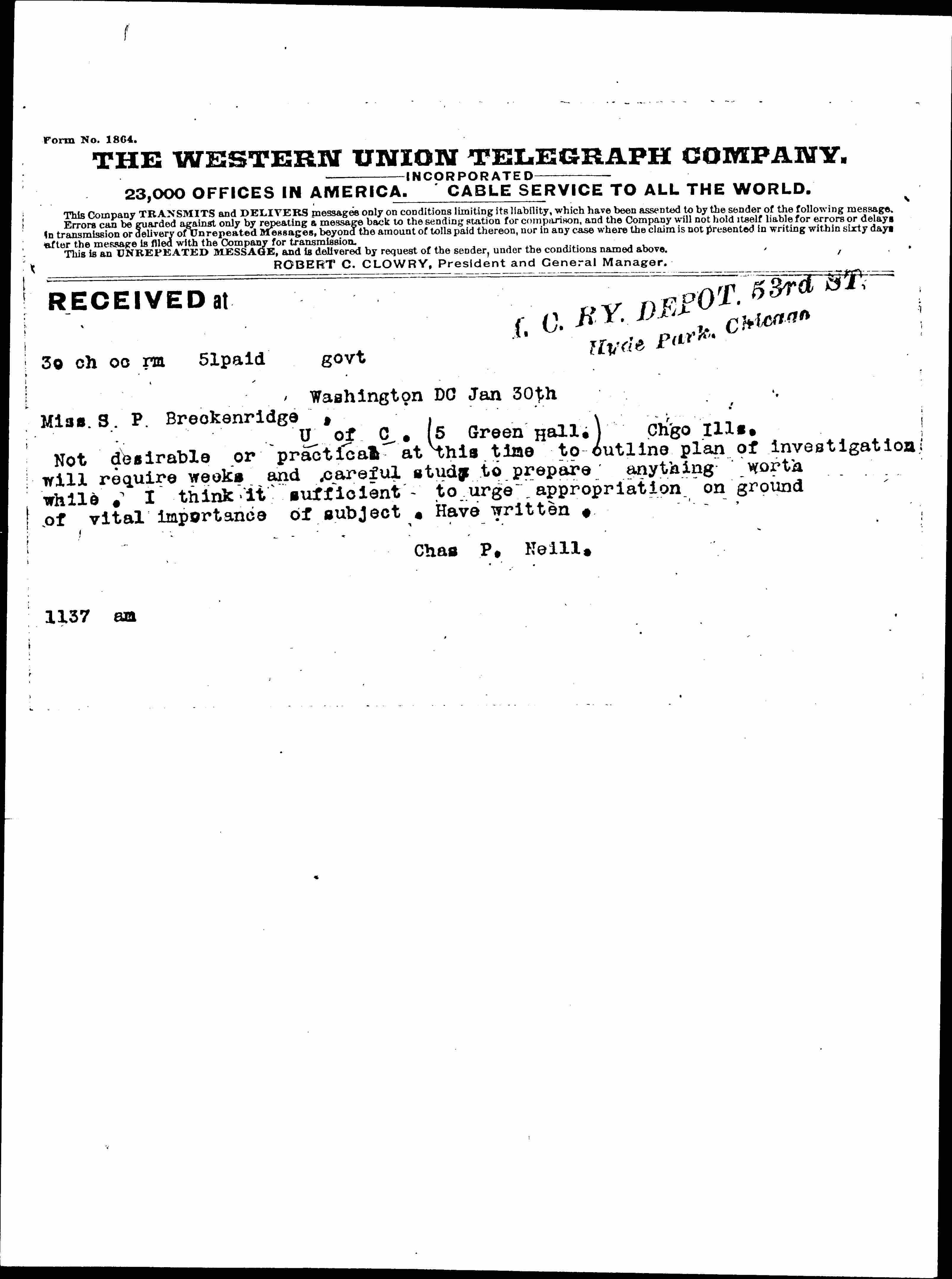RECEIVED at M.C.R.Y. DEPOT. 53rd ST.
