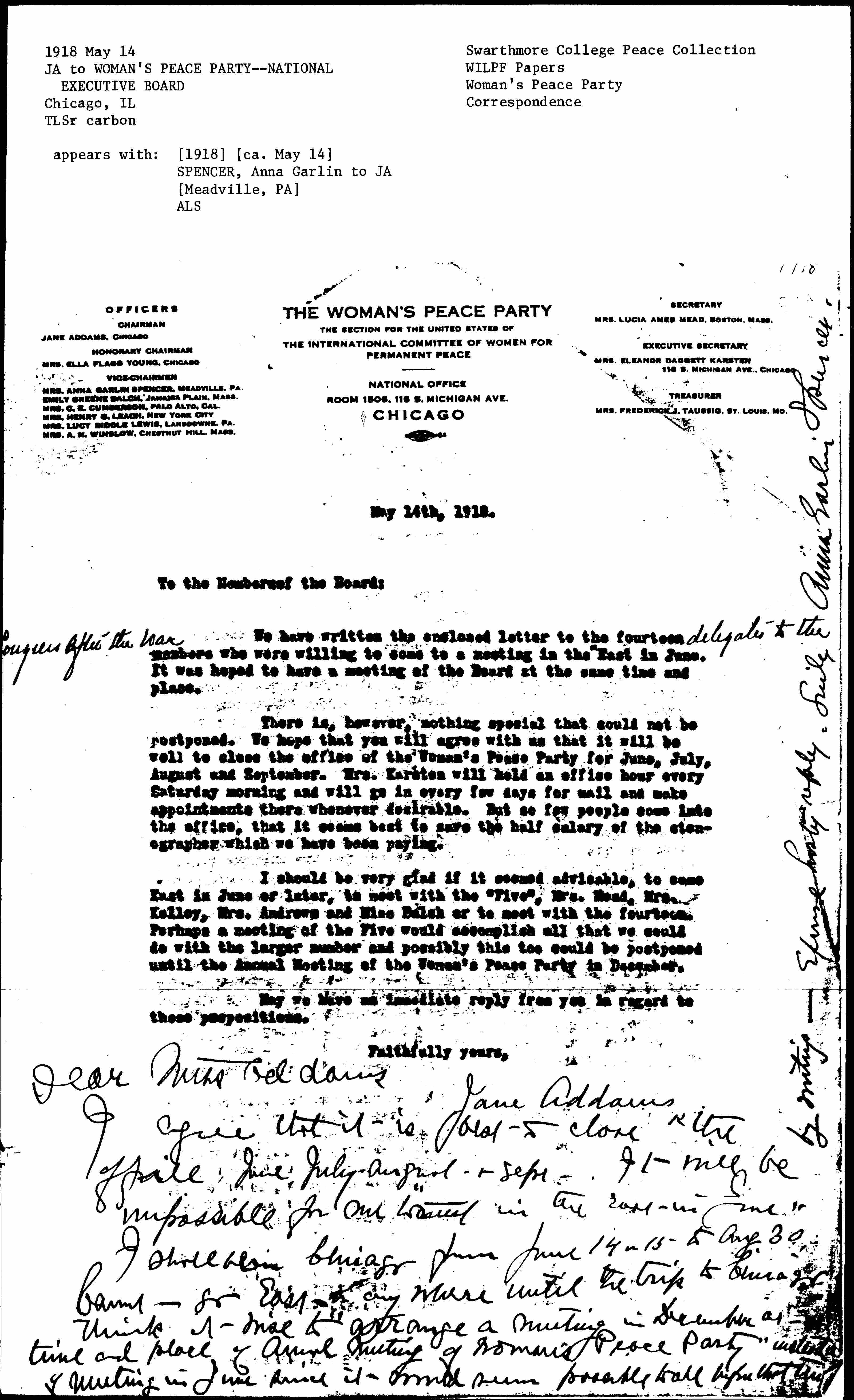 I agree that it is best to close the office June, July, August & Sept. It will be impossible for me to travel in the East in June. I shall be in Chicago from June 14 or 15 to Aug 30. Cannot go East any where until the trip to Chicago. Think it wise to arrange a meeting in December at time and place of Annual Meeting of Woman's Peace Party instead of meeting in June since it would seem possible to all before that [time] [written up right margin] by writing. Excuse hasty reply. [Sinc'ly] Anna Garlin Spencer.