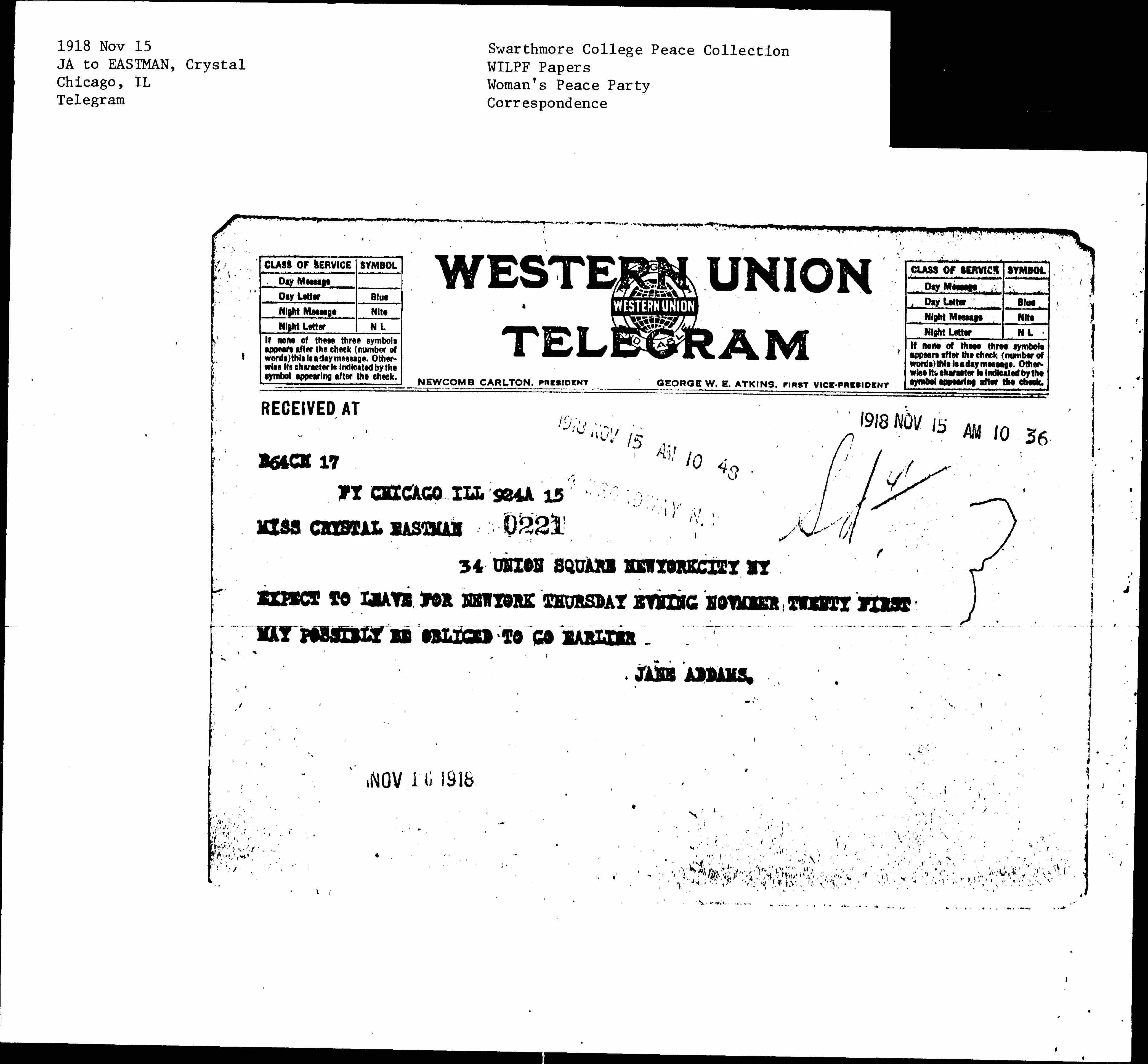 EXPECT TO LEAVE FOR NEW YORK THURSDAY EVENING NOVEMBER TWENTY FIRST MAY POSSIBLY BE OBLIGED TO GO EARLIER