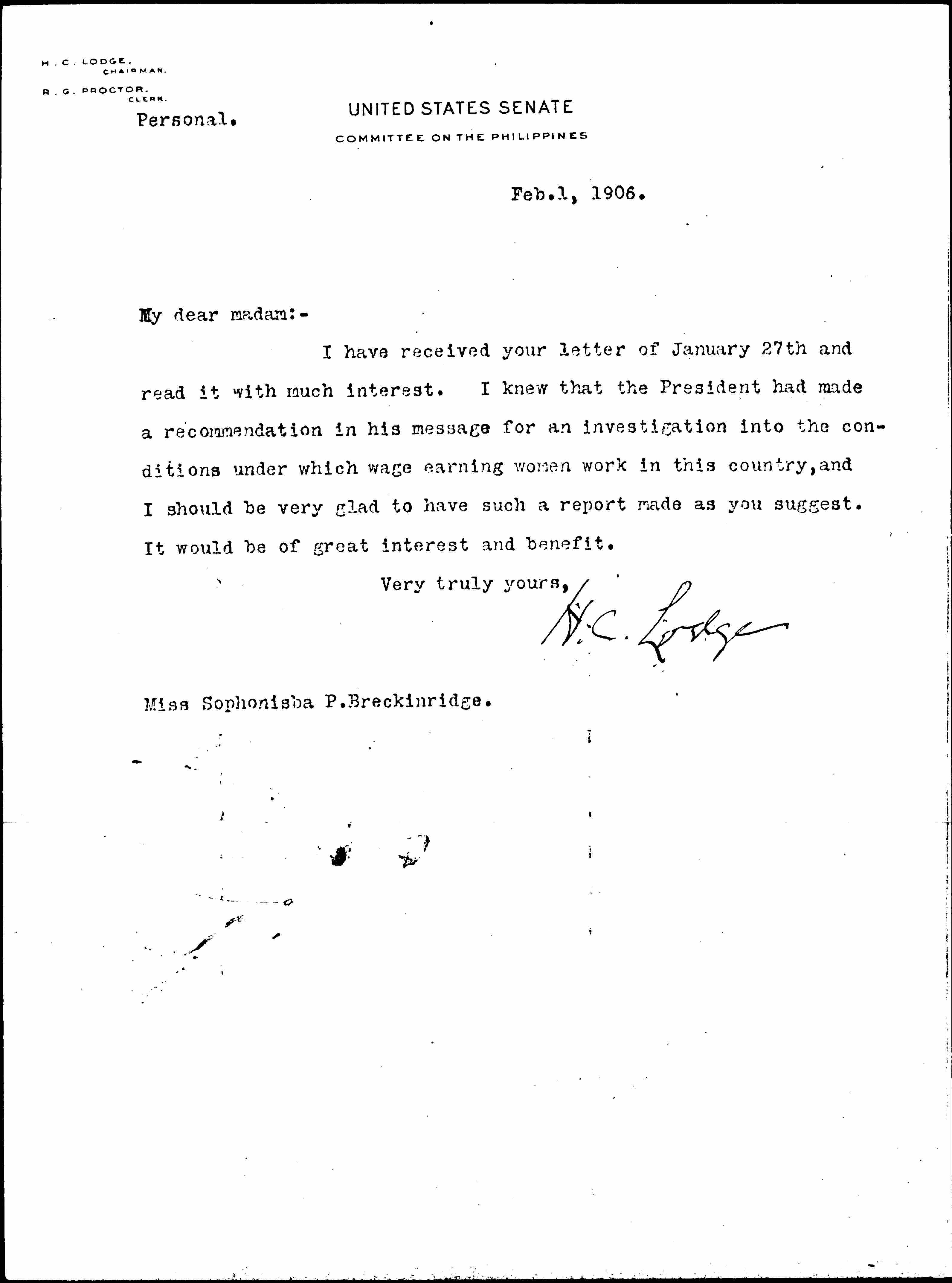 My dear madam:-I have received your letter of January 27th and read it with much interest. I knew that the President had made a recommendation in his message for an investigation into the conditions under which wage earning women work in this country, and I should be very glad to have such a report made as you suggest. It would be of great interest and benefit.