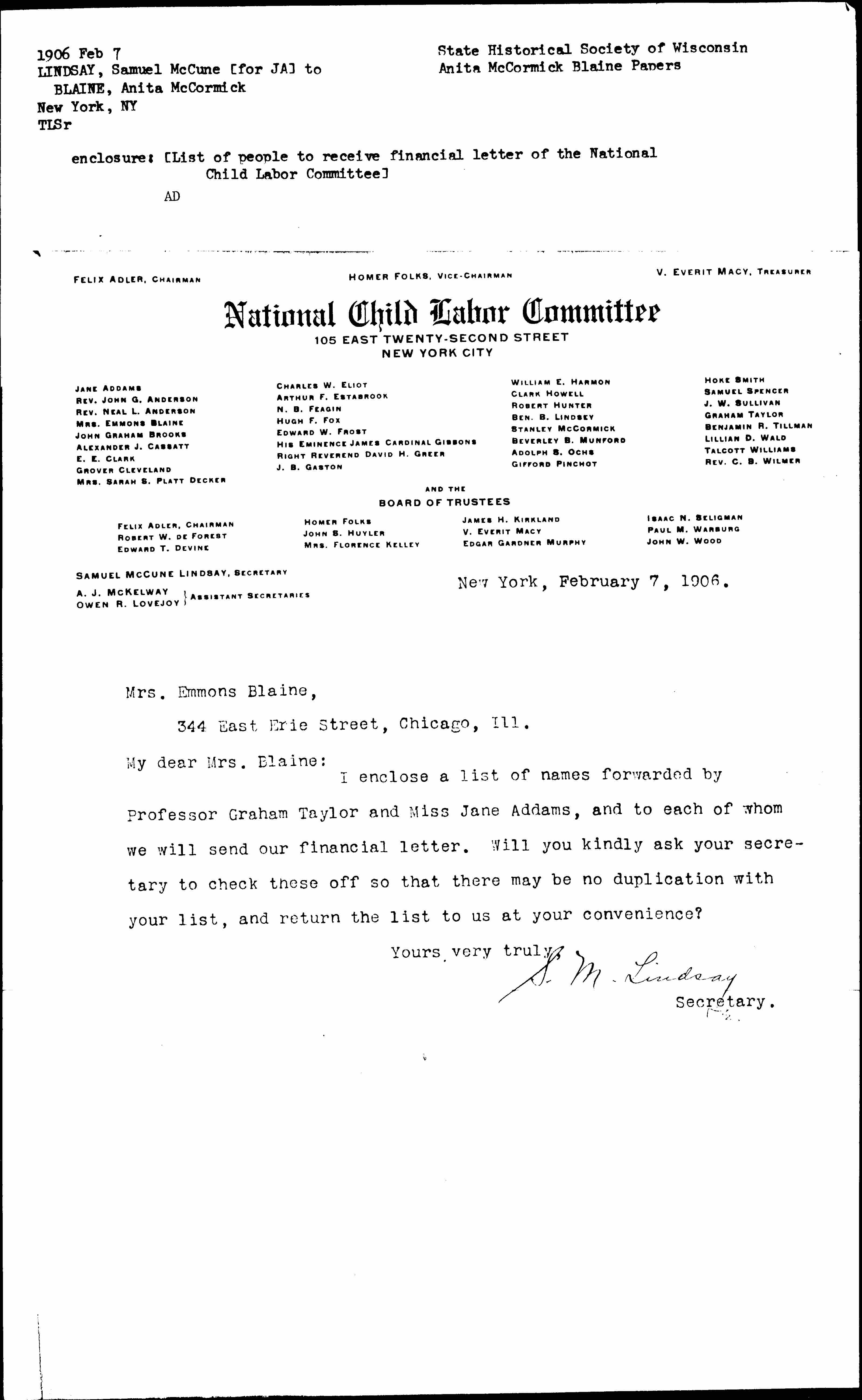 I enclose a list of names forwarded by Professor Graham Taylor and Miss Jane Addams, and to each of whom we will send our financial letter. Will you kindly ask your secretary to check these off so that there may be no duplication with your list, and return to the list to us at your convenience?
