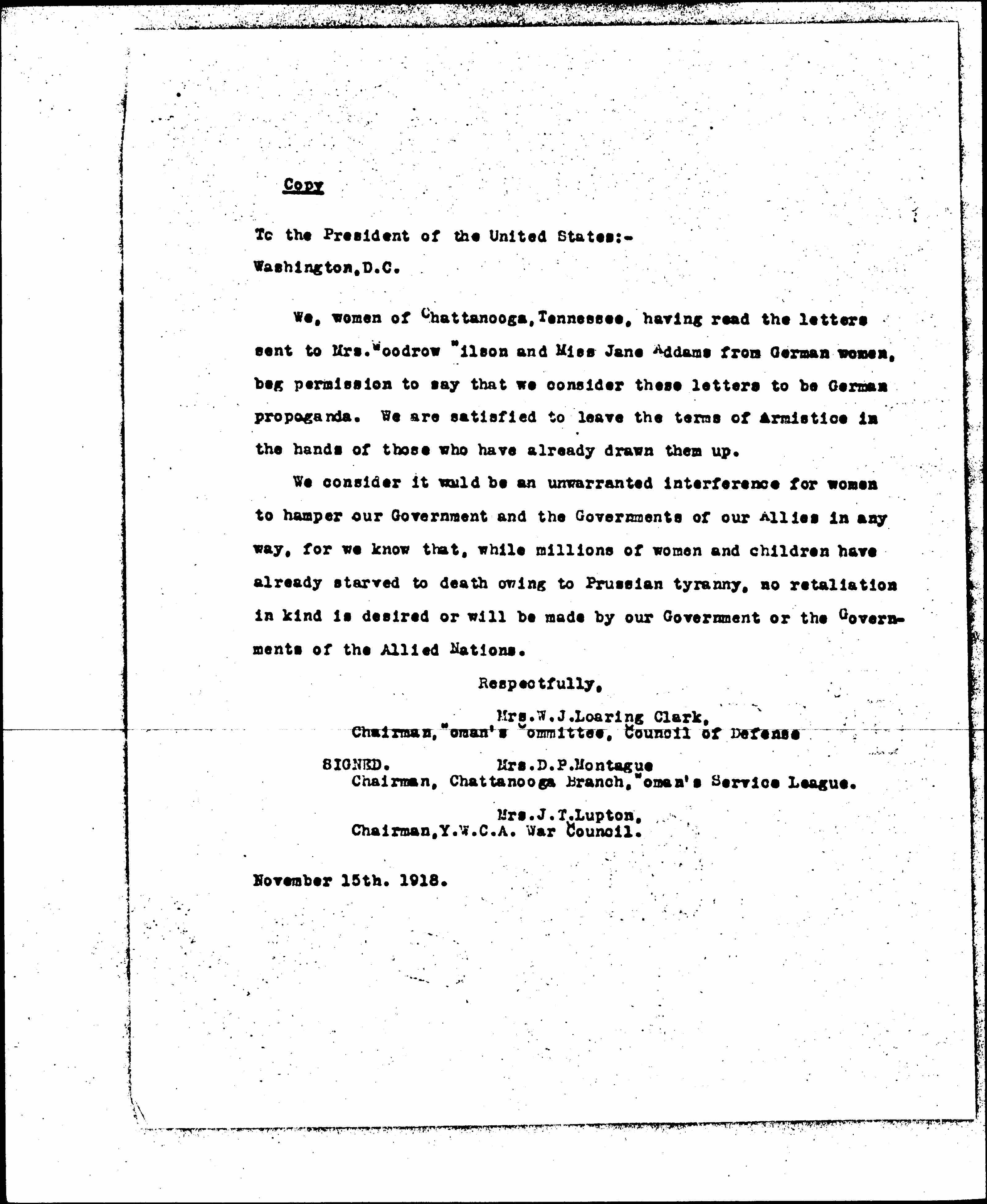 We, women of Chattanooga, Tennessee, having read the letters sent to Mrs. Woodrow Wilson and Miss Jane Addams from German women, beg permission to say that we consider these letters to be German propaganda. We are satisfied to leave the terms of Armistice in the hands of those who have already drawn them up.