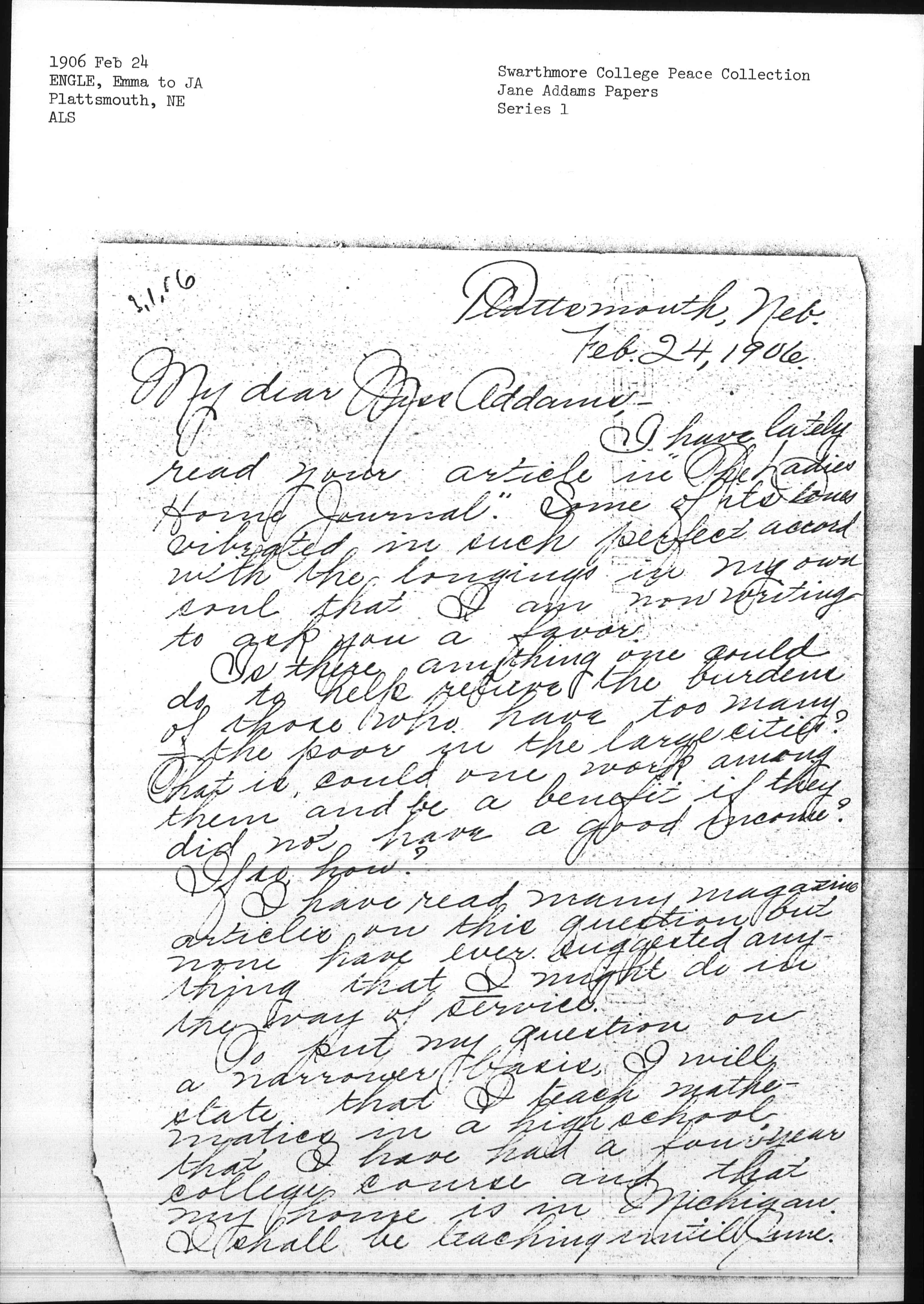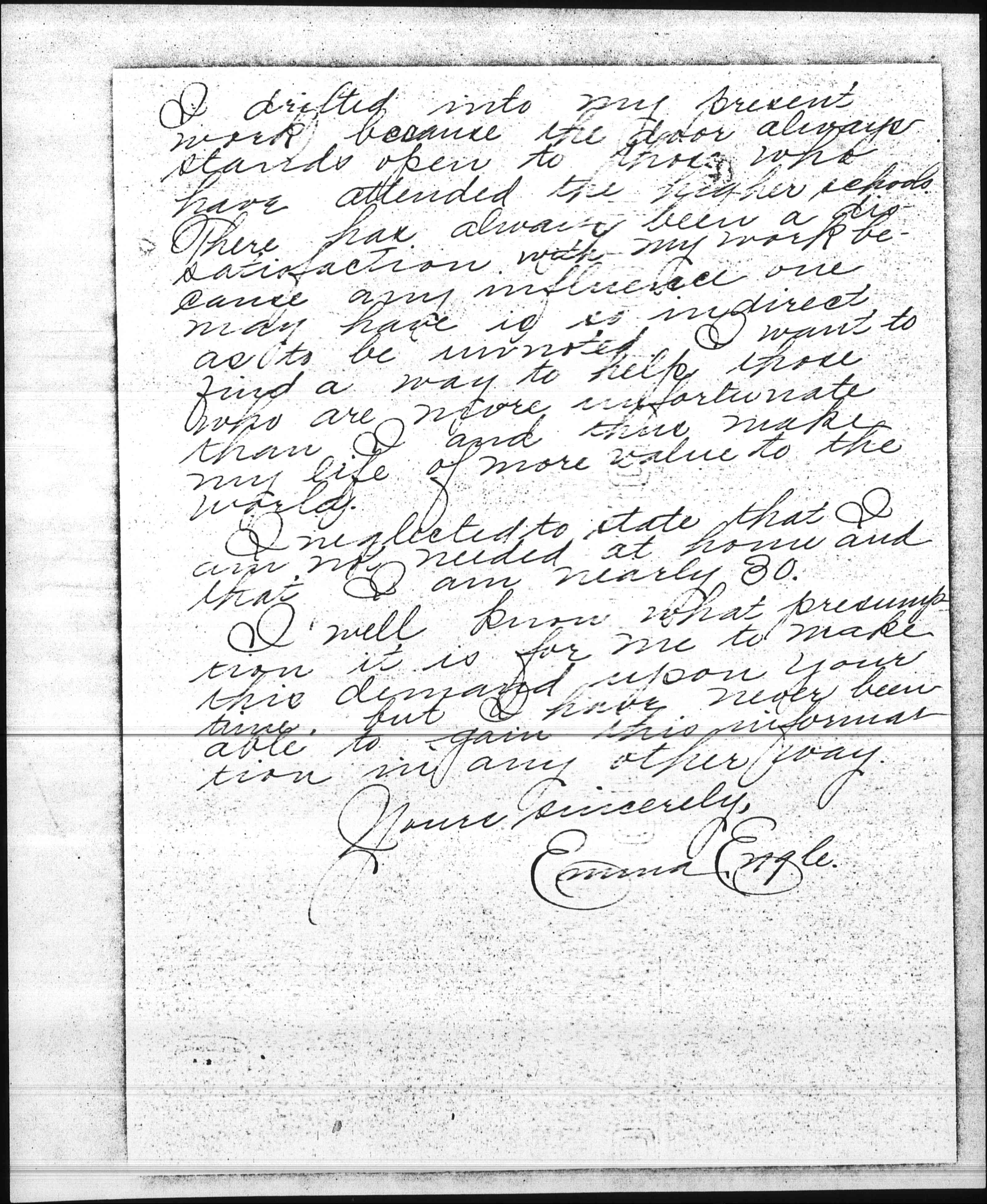 To put my question on a narrower basis, I will state that I teach mathematics in a high school, that I have had a four year college course and that my home is in Michigan. I shall be teaching until June. [page 2] I drifted into my present work because the door always stands open to those who have attended the higher schools. There has always been a dissatisfaction with my work because any influence one may have is so indirect as to be unnoted. I want to find a way to help those who are more unfortunate than I and then make my life of more value to the world.