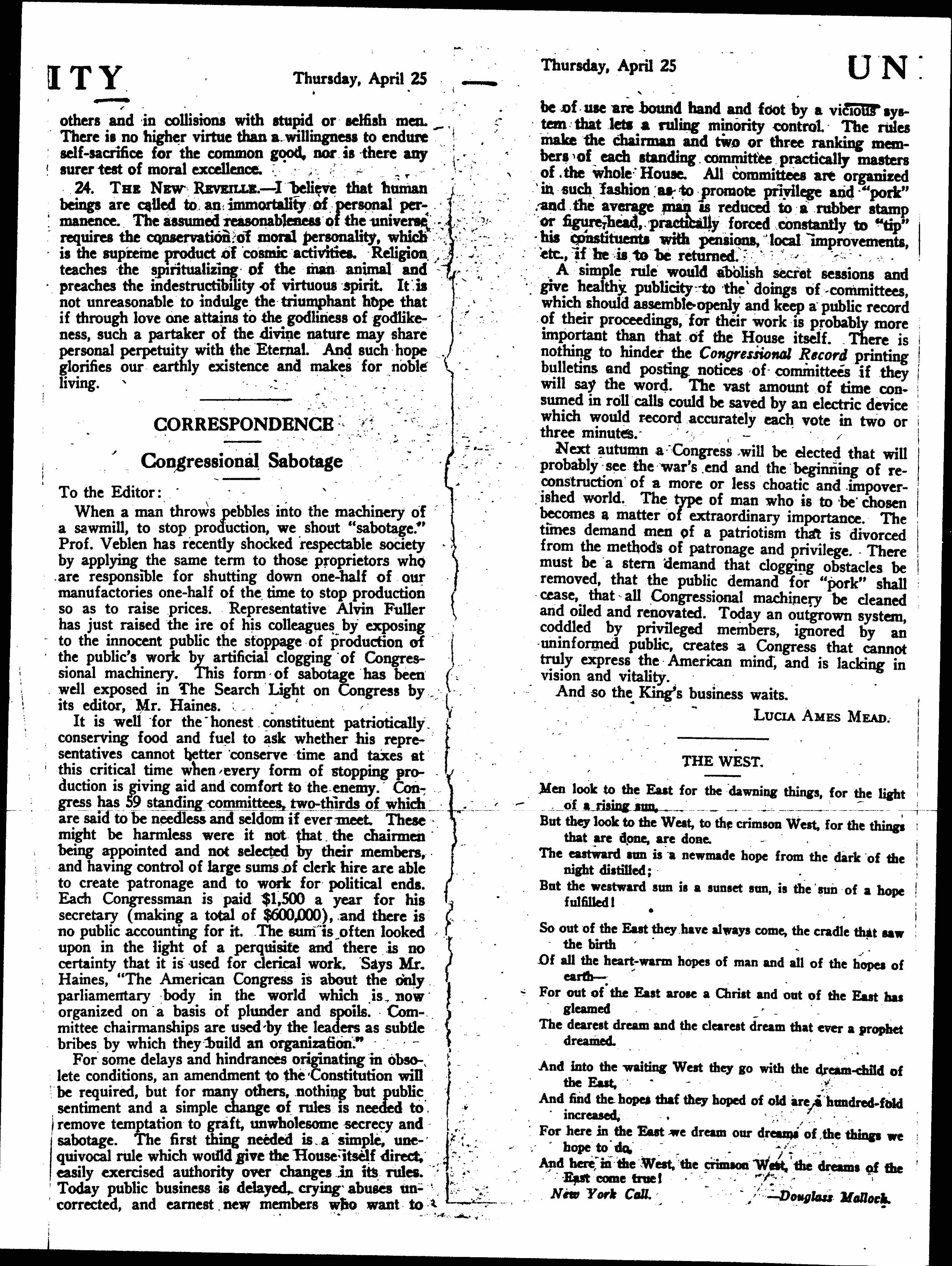 When a man throws pebbles into the machinery of a sawmill, to stop production, we shout "sabotage." Prof. Veblen has recently shocked respectable society by applying the same term to those proprietors who are responsible for shutting down one-half of our manufactories one-half of the time to stop production so as to raise prices. Representative [Alvan] Fuller has just raised the ire of his colleagues by exposing to the innocent public the stoppage of production of the public's work by artificial clogging of Congressional machinery. This form of sabotage has been well exposed in The Search Light on Congress by its editor, Mr. Haines.