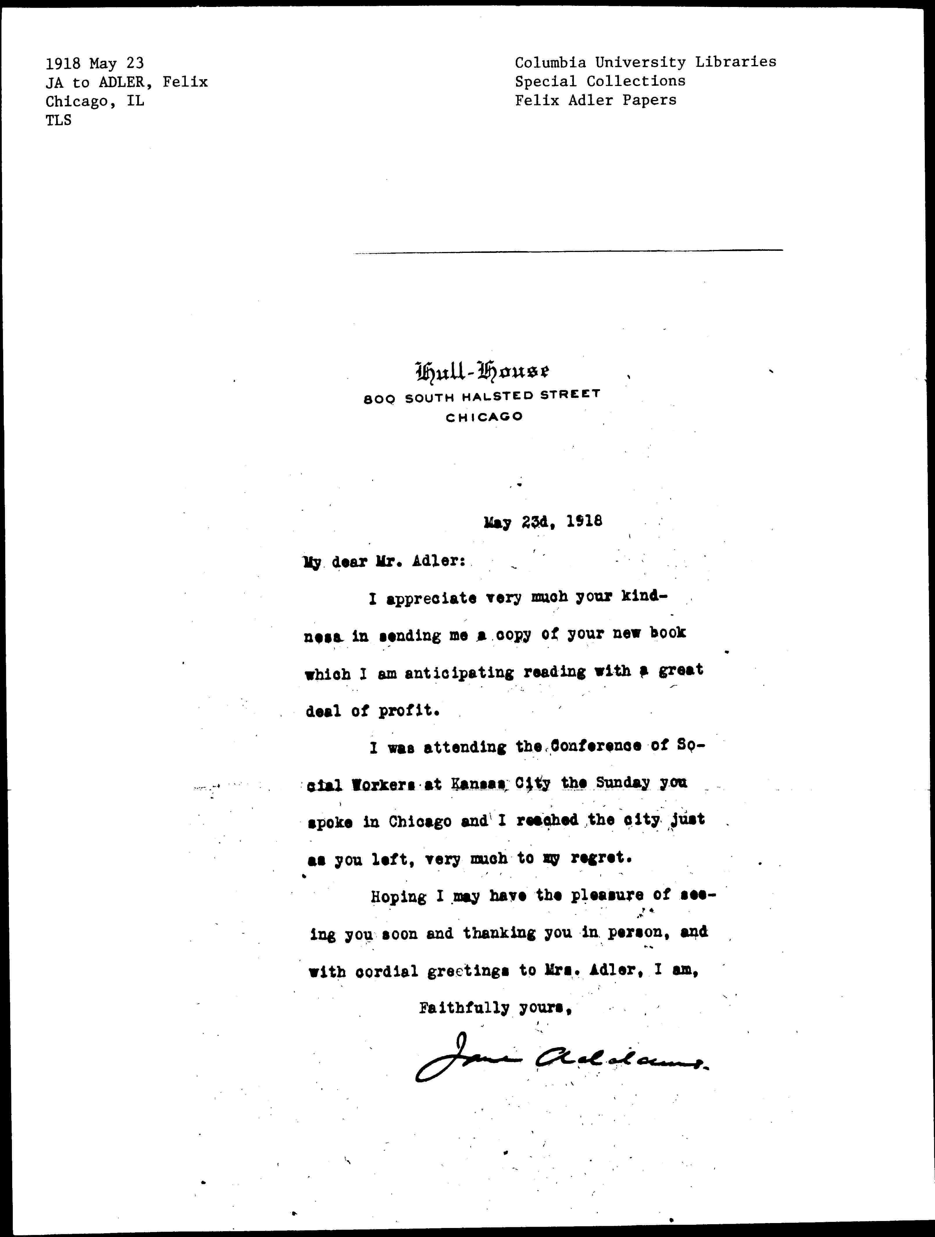 I was attending the Conference of Social Workers at Kansas City the Sunday you spoke in Chicago and I reached the city just as you left, very much to my regret.