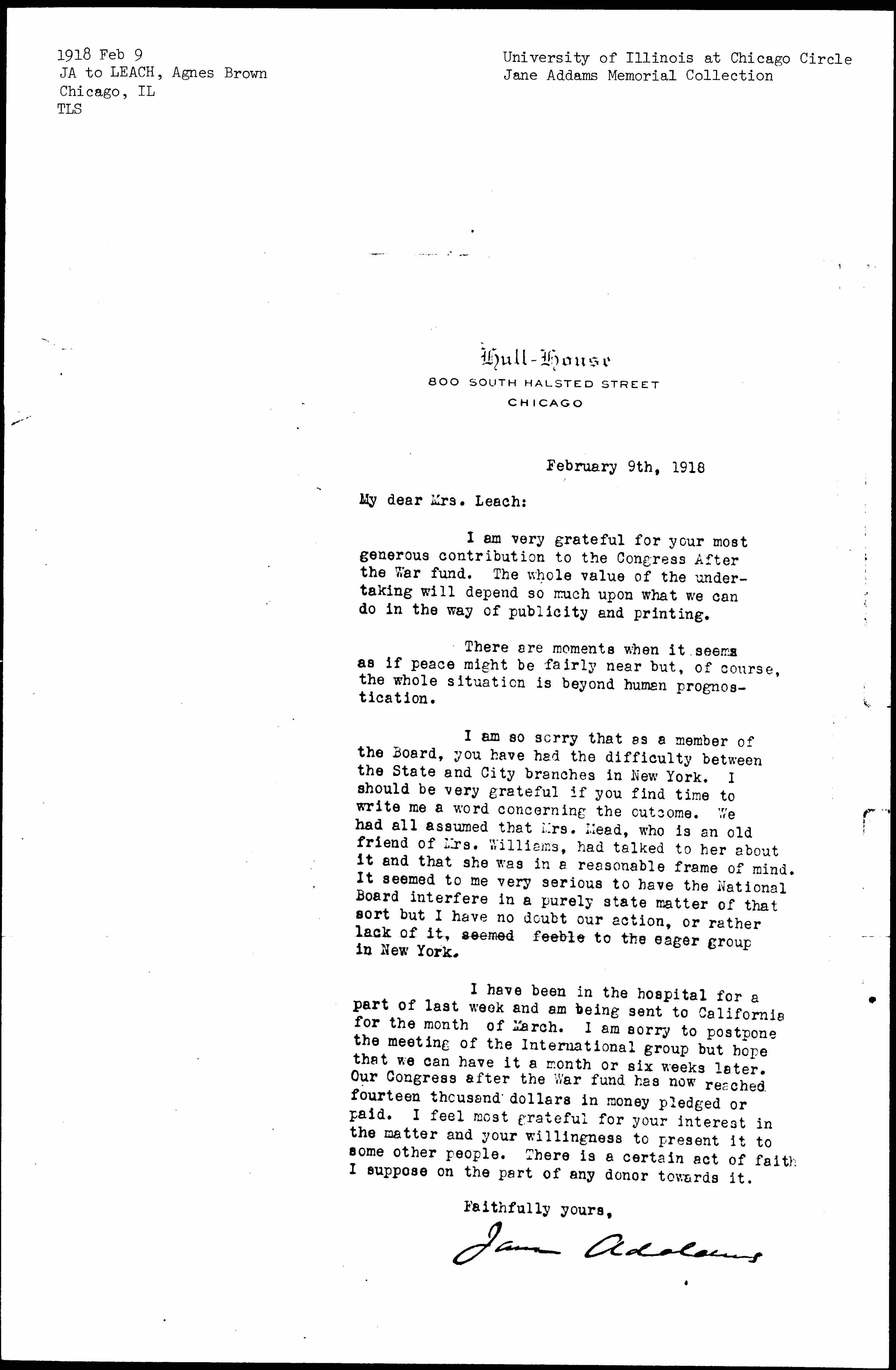 I have been in the hospital for a part of last week and am being sent to California for the month of March. I am sorry to postpone the meeting of the International group but hope that we can have it a month or six weeks later. Our Congress after the War fund has now reached fourteen thousand dollars in money pledged or paid. I feel most grateful for your interest in the matter and your willingness to present it to some other people. There is a certain act of faith I suppose on the part of any donor towards it.