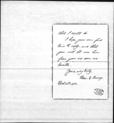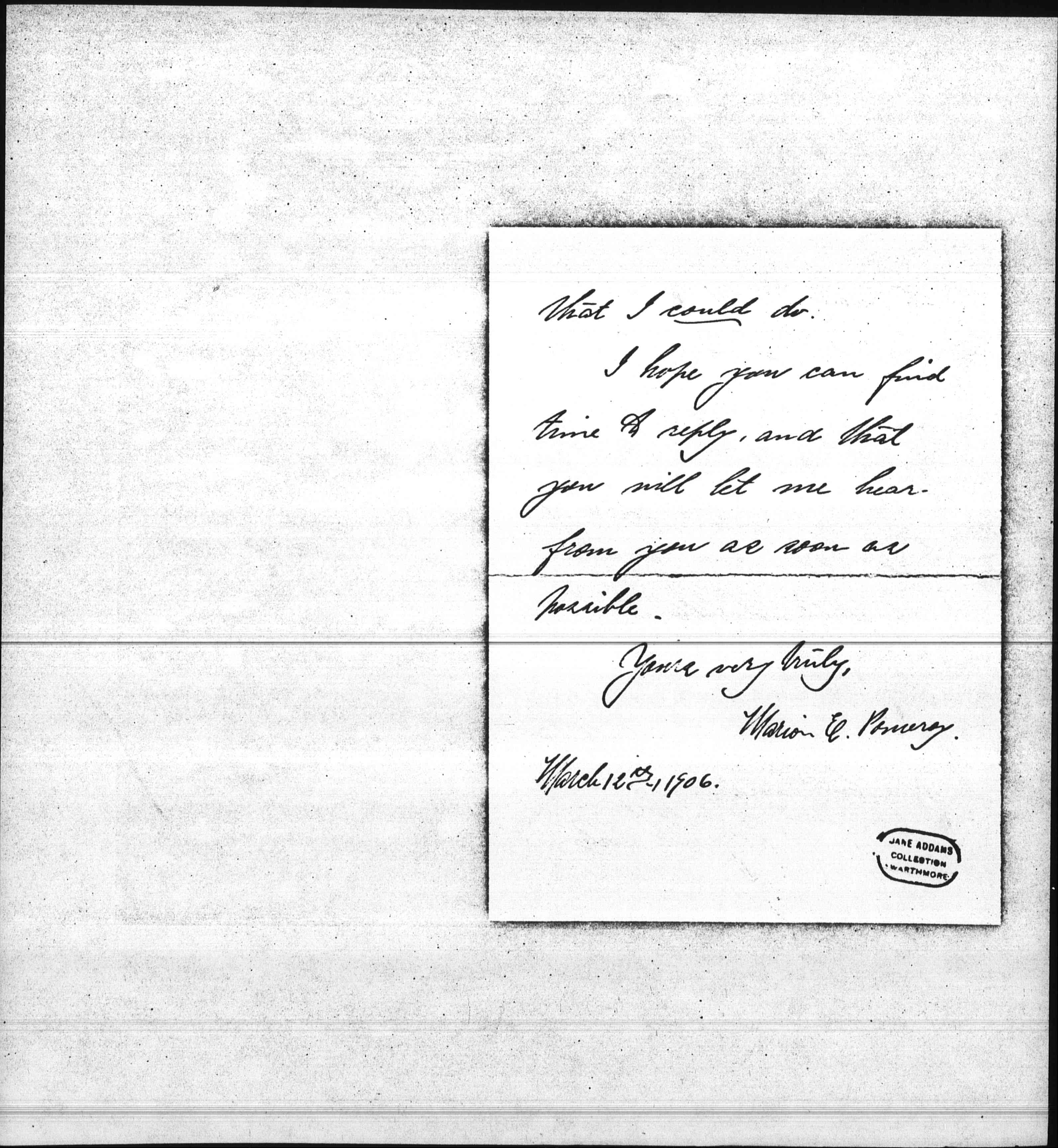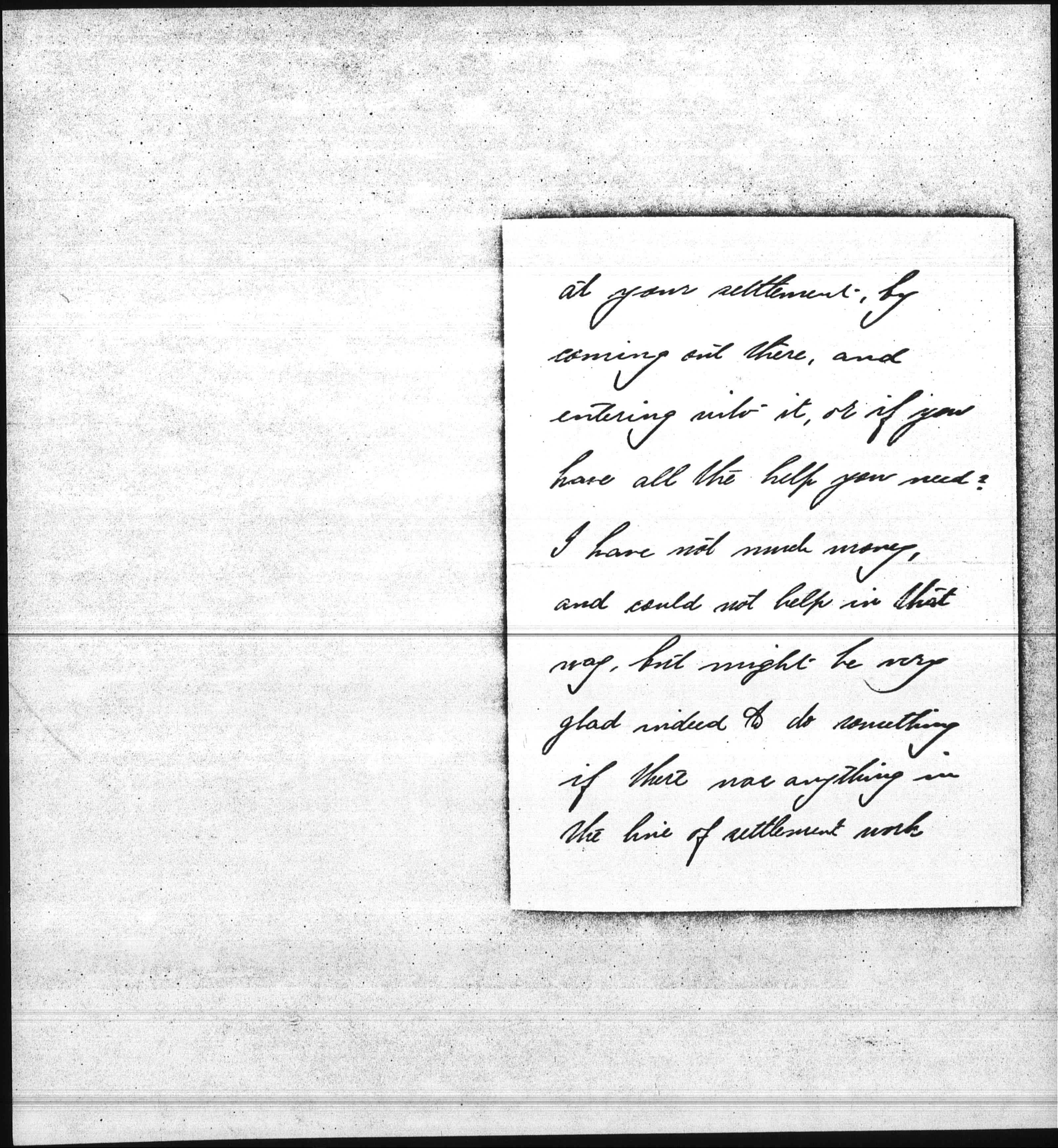 I read last evening your article in the "Ladies' Home Journal," and write to ask if there is anything one could do in the way of personal work [page 2] at your settlement, by coming out there, and entering into it, or if you have all the help you need? I have not much money, and could not help in that way, but might be very glad indeed to do something if there was anything in the line of settlement work [page 3] that I could do.