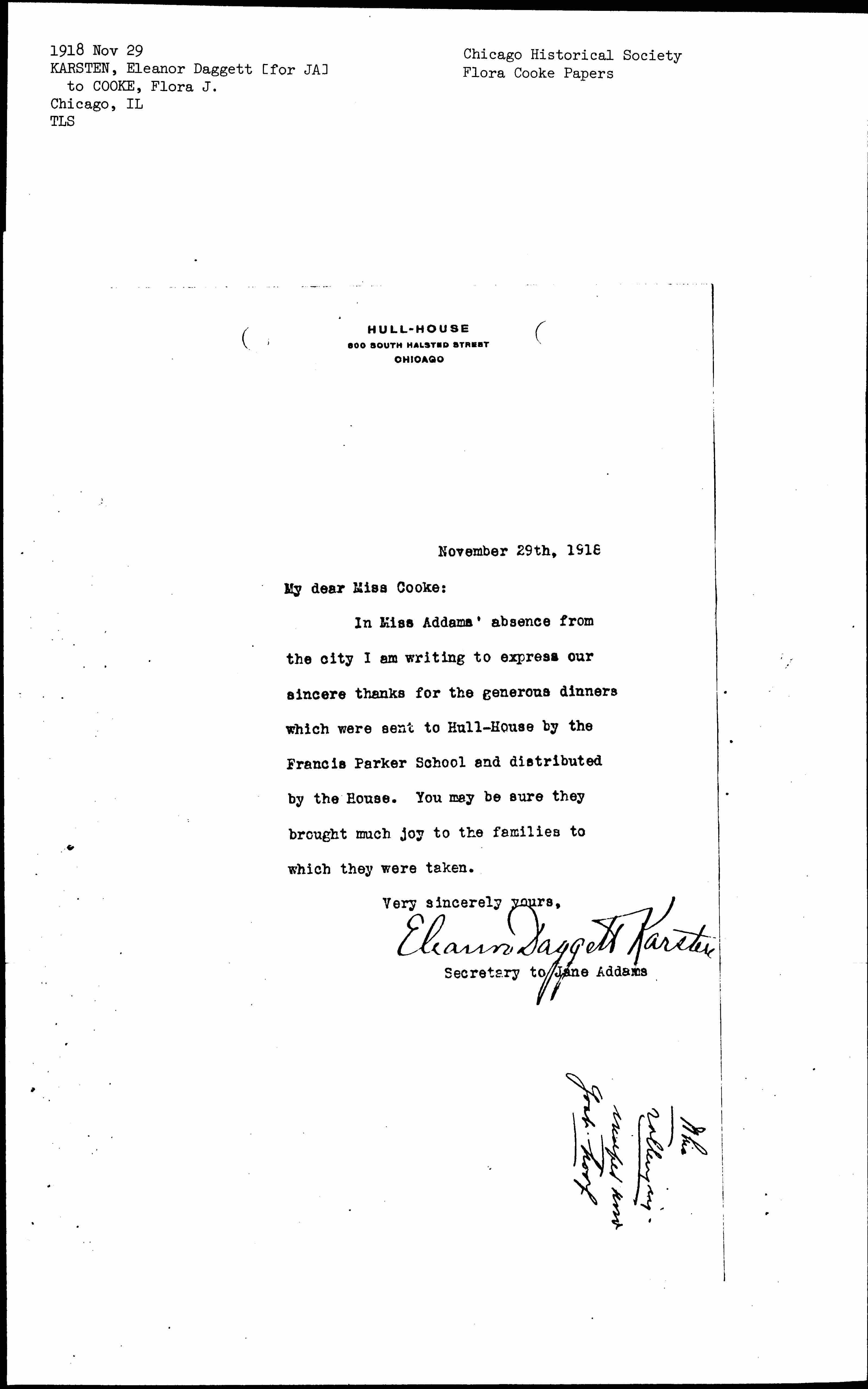In Miss Addams' absence from the city I am writing to express our sincere thanks for the generous dinners which were sent to Hull-House by the Francis Parker School and distributed by the House. You may be sure they brought much joy to the families to which they were taken.