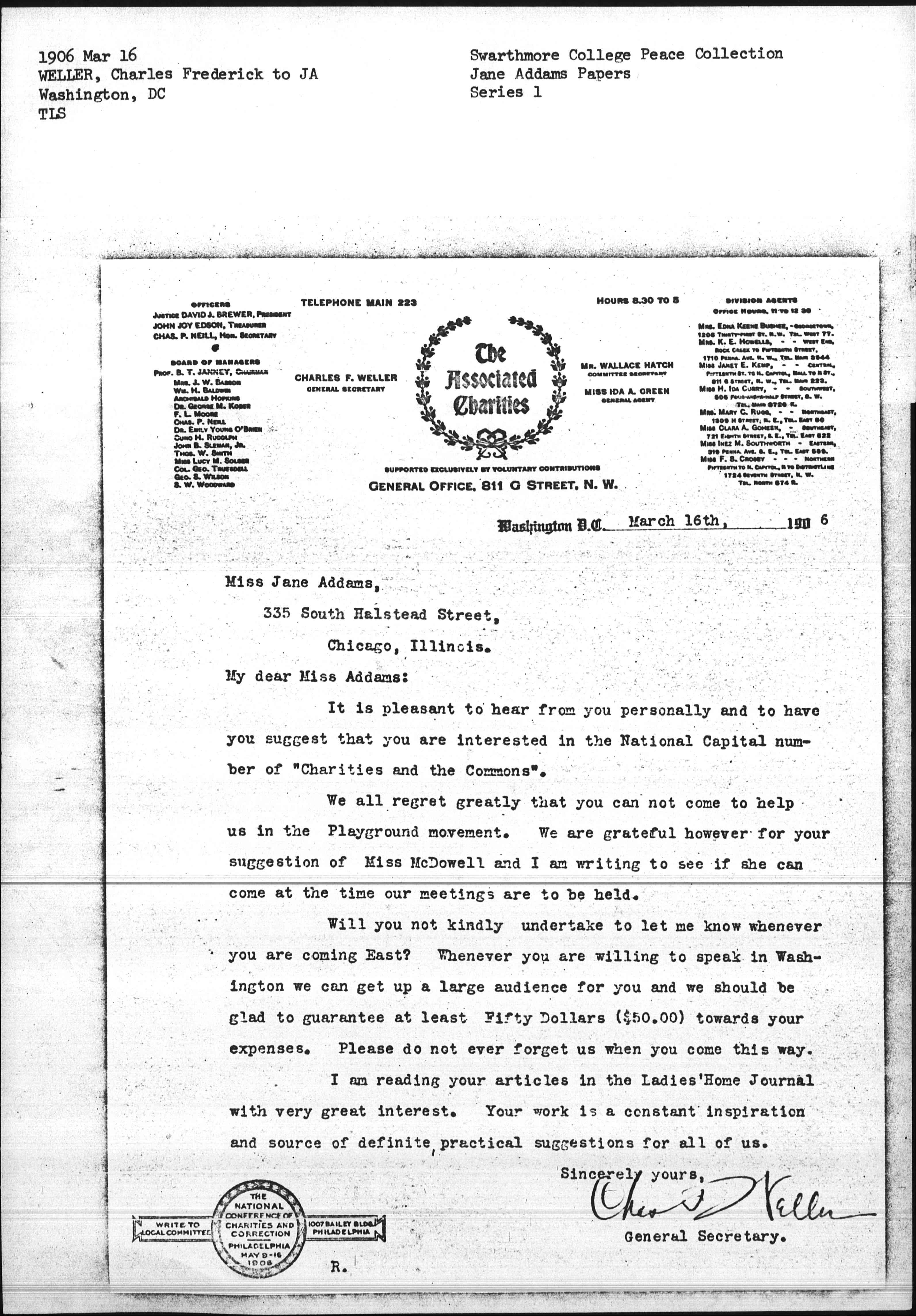 We all regret greatly that you can not come to help us in the Playground movement. We are grateful however for your suggestion of Miss McDowell and I am writing to see if she can come at the time our meetings are to be held.