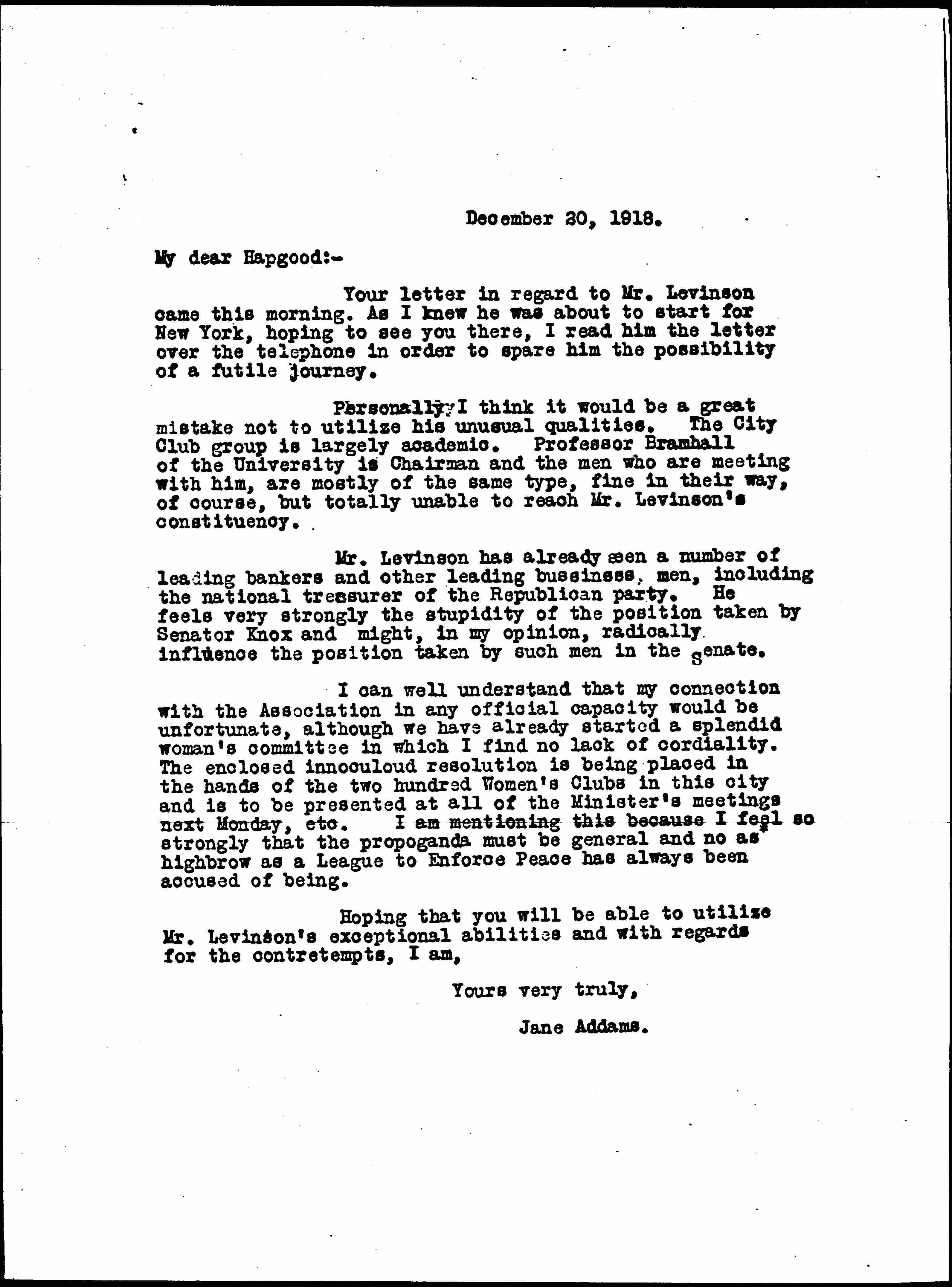 Personally I think it would be a great mistake not to utilize his unusual qualities. The City Club group is largely academic. Professor Bramhall of the University is Chairman and the men who are meeting with him, are mostly of the same type, fine in their way, of course, but totally unable to reach Mr. Levinson’s constituency.