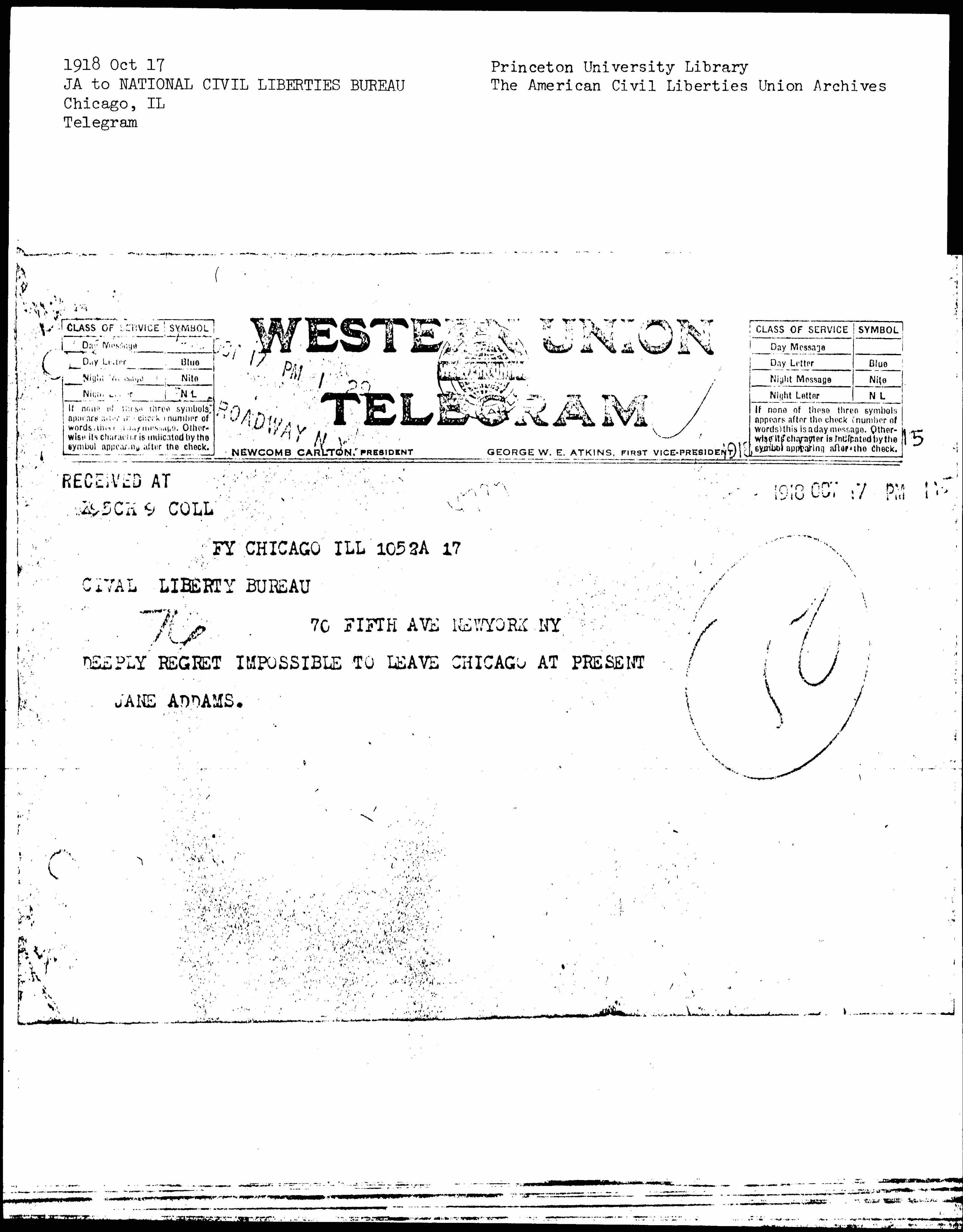 DEEPLY REGRET IMPOSSIBLE TO LEAVE CHICAGO AT PRESENT