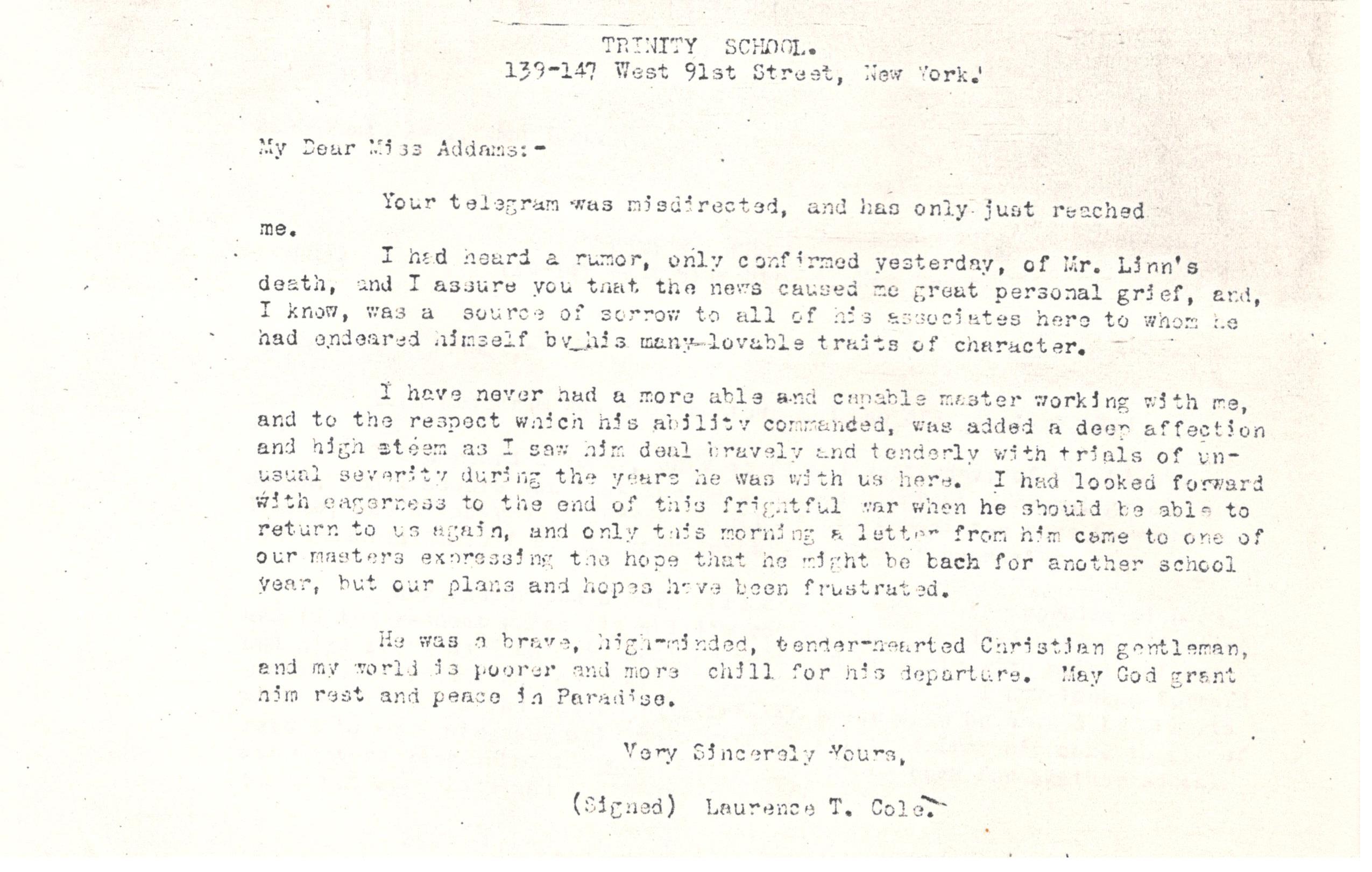 I have never had a more able and capable master working with me, and to the respect which his ability commanded, was added a deep affection and high [esteem] as I saw him deal bravely and tenderly with trials of unusual severity during the years he was with us here. I had looked forward with eagerness to the end of this frightful war when he should be able to return to us again, and only this morning a letter from him came to one of our masters expressing the hope that he might be [back] for another school year, but our plans and hopes have been frustrated.