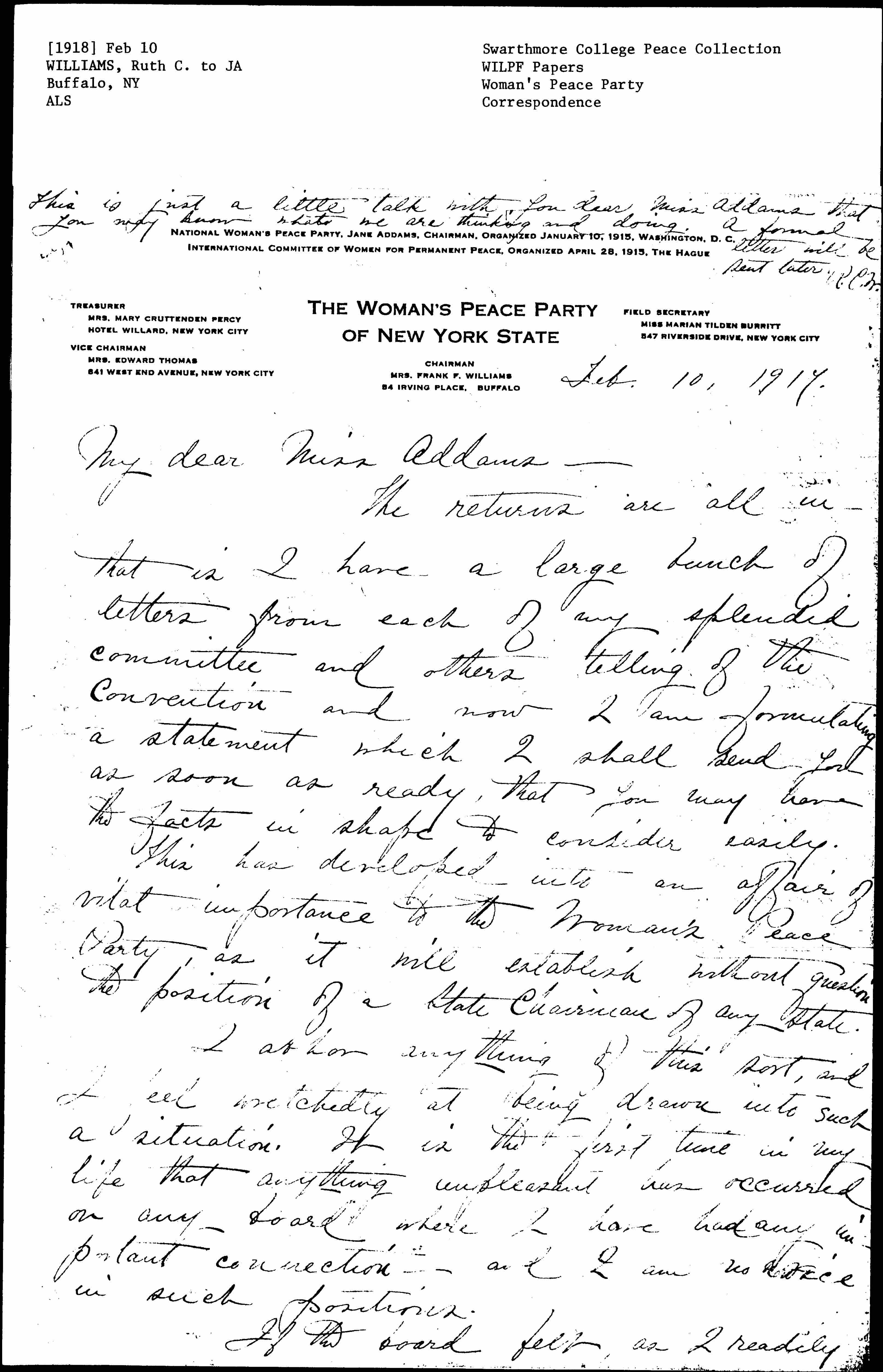 "It seems to me also that to say 'there is a New York State Branch of the Woman's Peace Party' is not quite accurate". As far as "Branch" is concerned, why look at the name above -- I confess it was a happen!