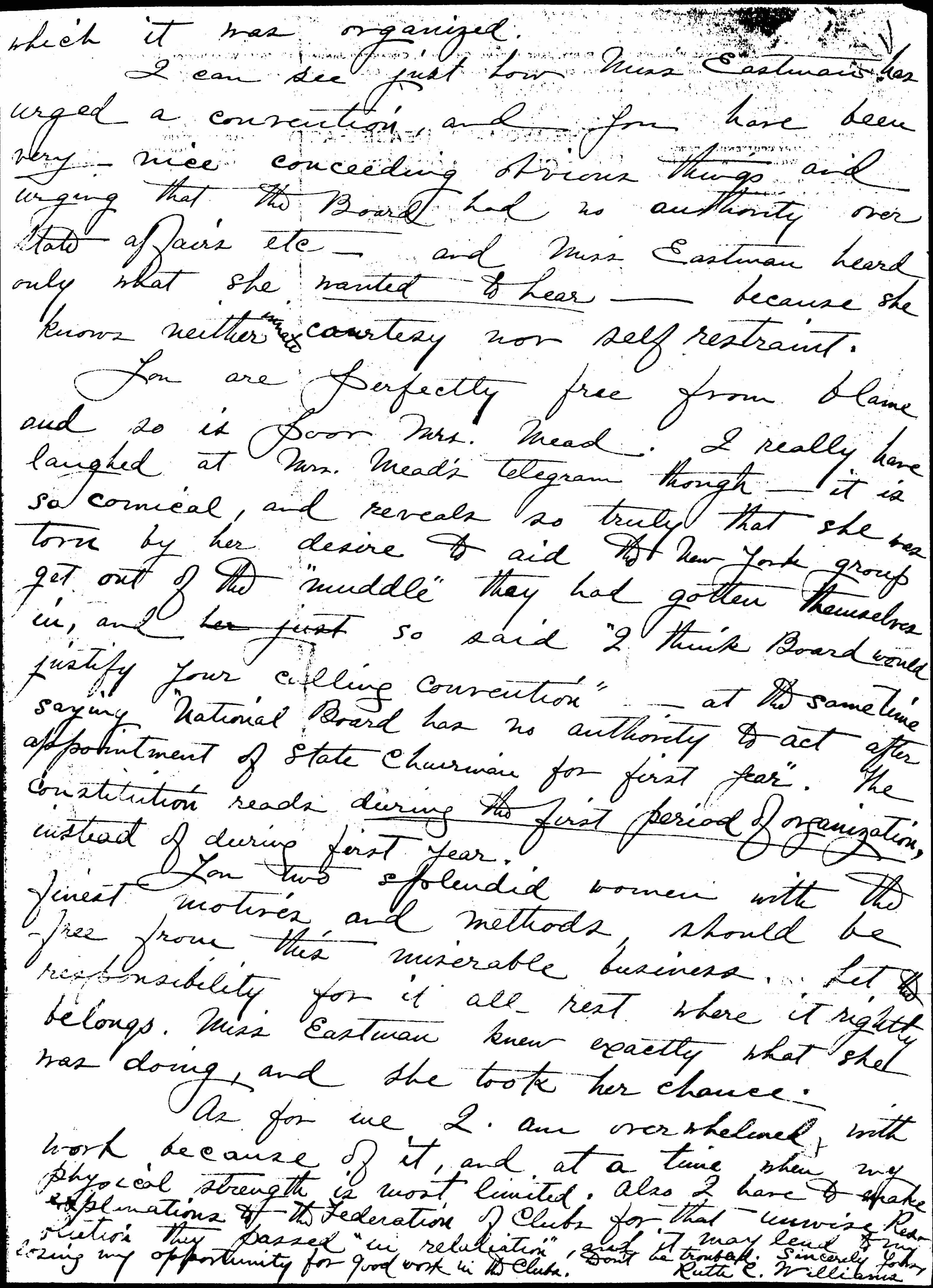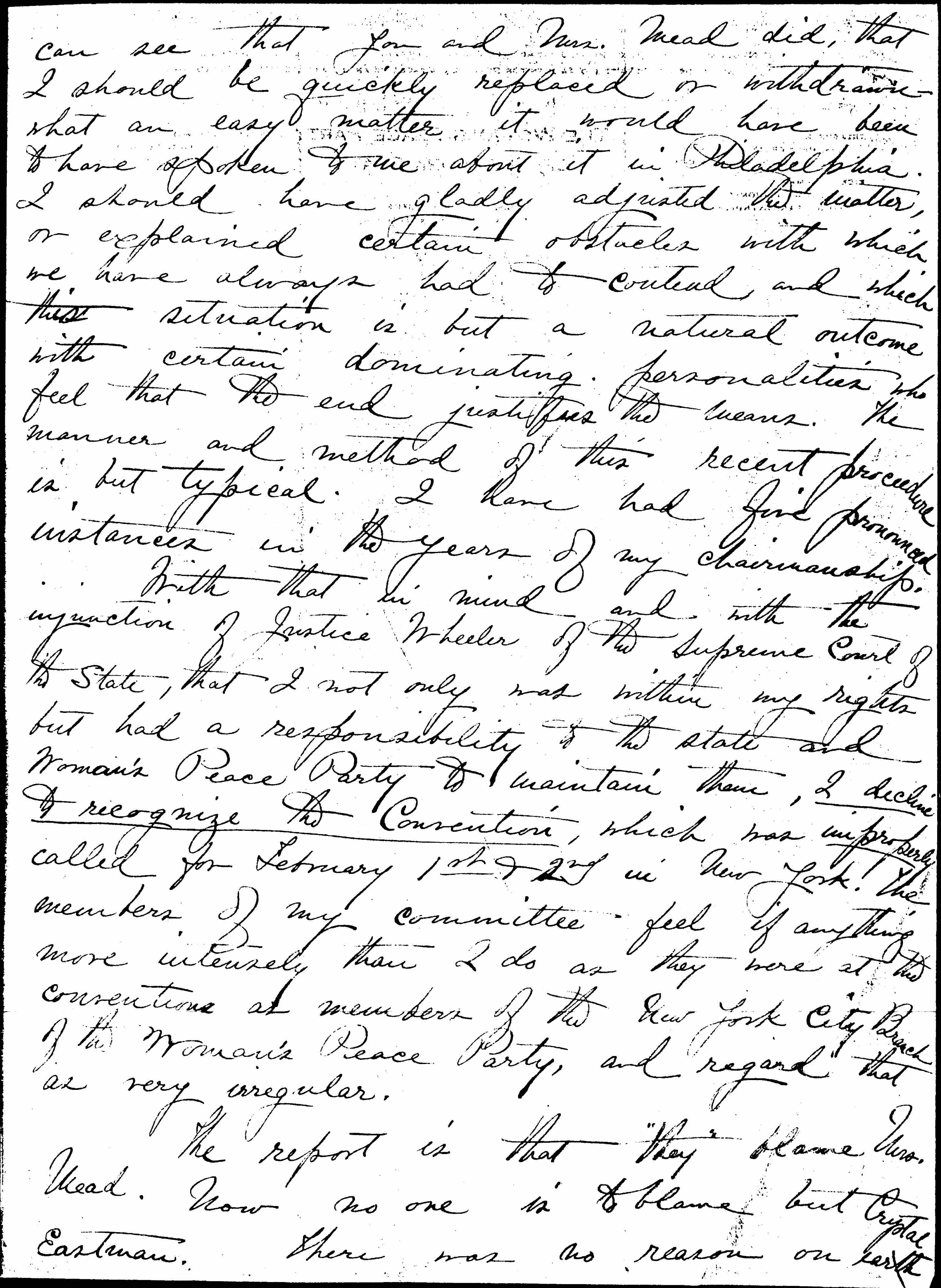The report is that "they" blame Mrs. Mead. Now no one is to blame but Crystal Eastman. There was no reason on earth [page 3] why she should not possess courtesy enough to ask me herself to call a convention if she wanted one.