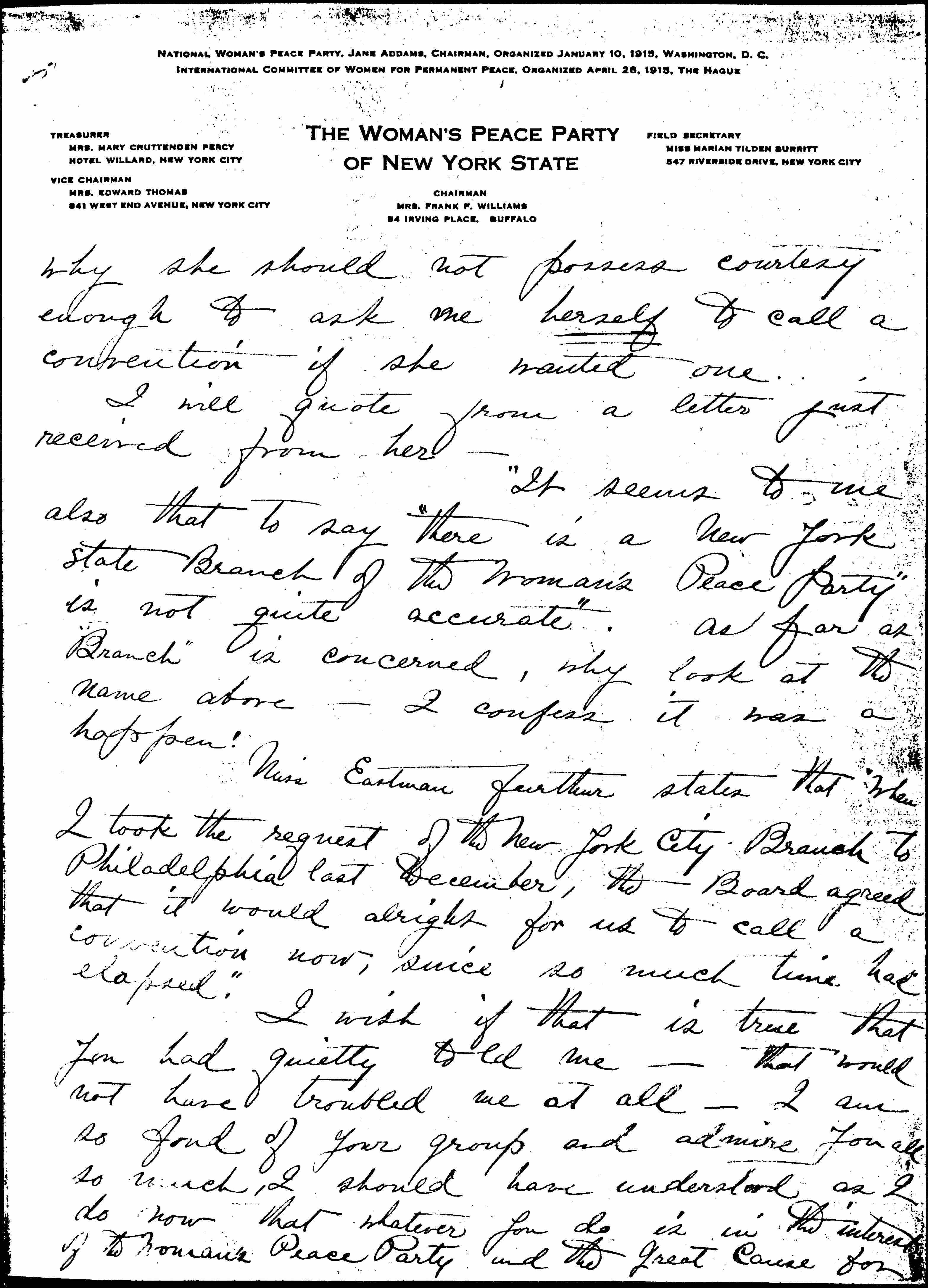 With that in mind and with the injunction of Justice Wheeler of the Supreme Court of the State, that I not only was within my rights but had a responsibility to the state and Woman's Peace Party to maintain them, I decline to recognize the Convention, which was improperly called for February 1st & 2nd in New York! The members of my committee feel if anything more intensely than I do as they were at the convention as members of the New York City Branch of the Woman's Peace Party, and regard that as very irregular.