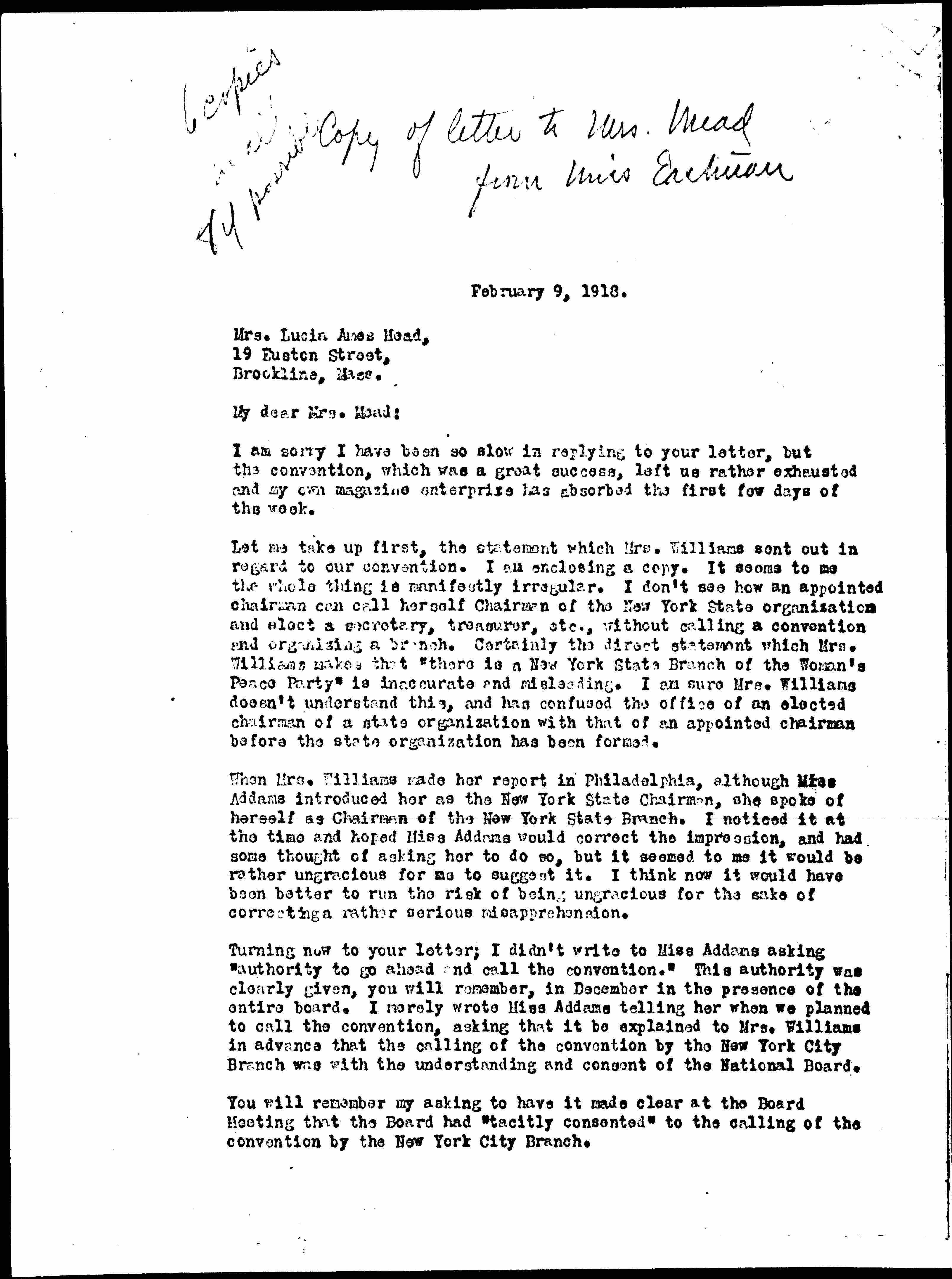 Turning now to your letter; I didn't write to Miss Addams asking "authority to go ahead and call the convention." This authority was clearly given, you will remember, in December in the presence of the entire board. I merely wrote Miss Addams telling her when we planned to call the convention, asking that it be explained to Mrs. Williams in advance that the calling of the convention by the New York City Branch was with the understanding and consent of the National Board.