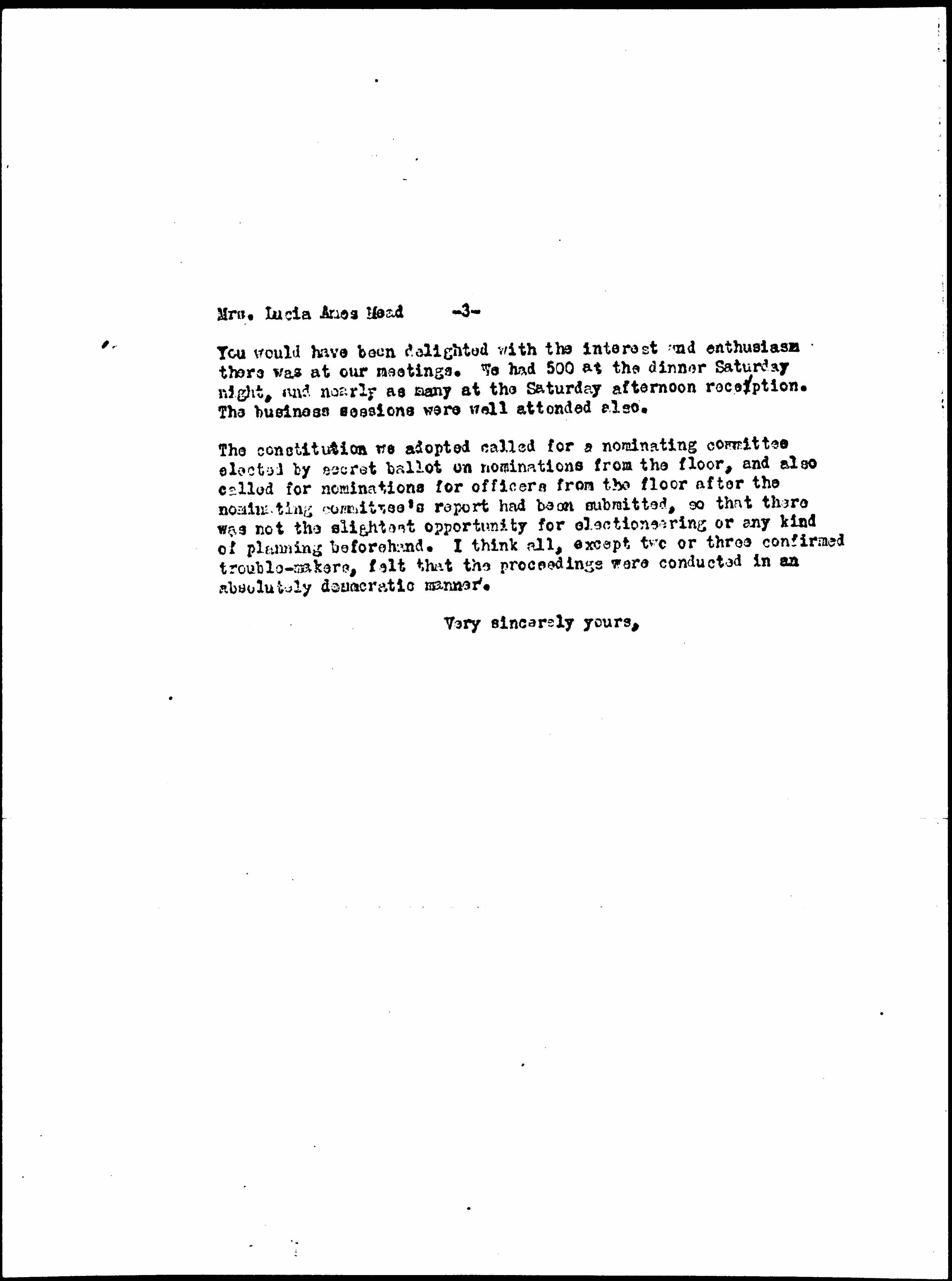The constitution we adopted called for a nominating committee elected by secret ballot on nominations from the floor, and also called for nominations for officers from the floor after the nominating committee's report had been submitted, so that there was not the slightest opportunity for electioneering or any kind of planning beforehand. I think all, except two or three confirmed trouble-makers, felt that the proceedings were conducted in an absolutely democratic manner.