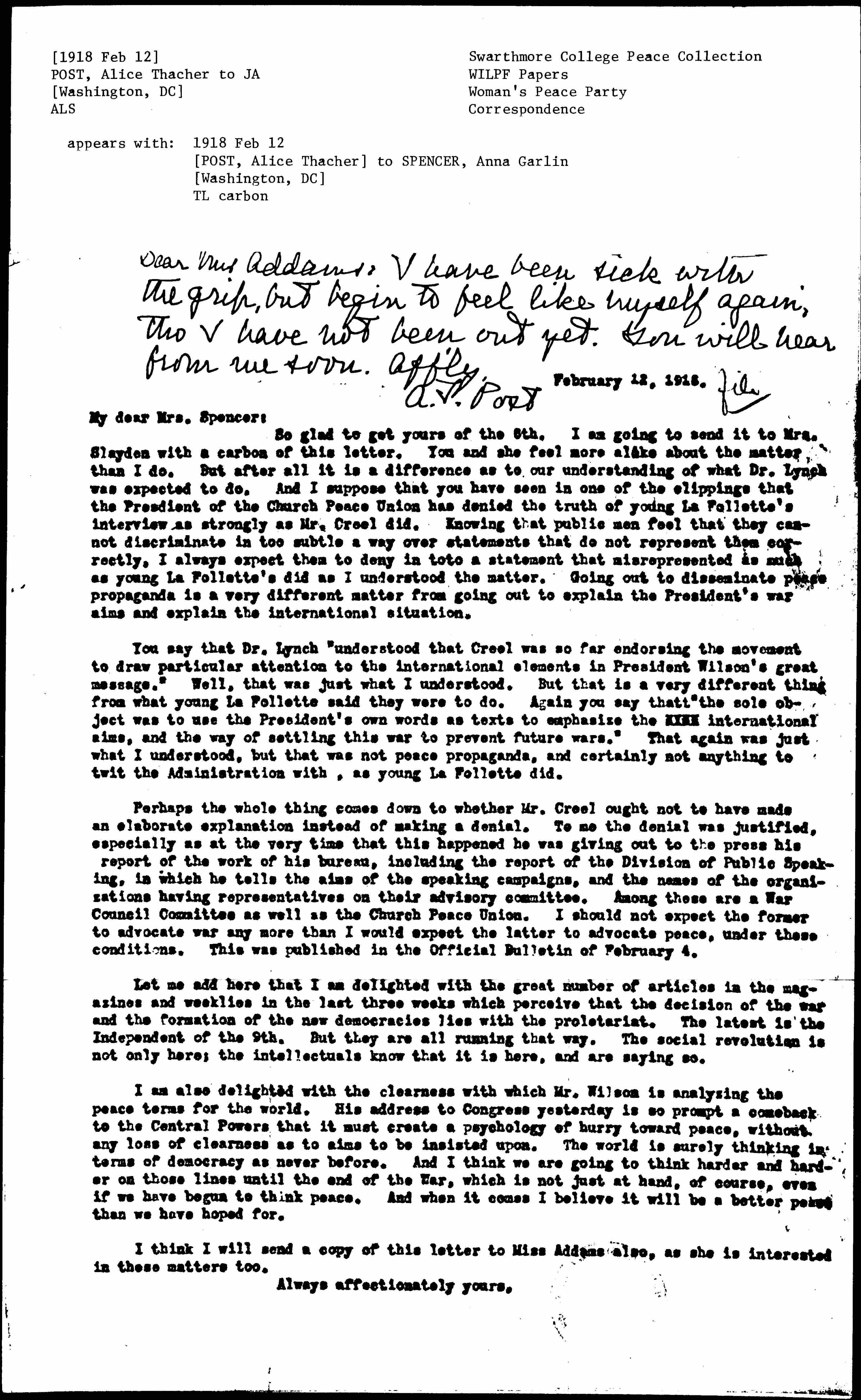 Dear Miss Addams: I have been sick with the [grippe], but begin to feel like myself again, [though] I have not been out yet. You will hear from me soon. Aff'ly,