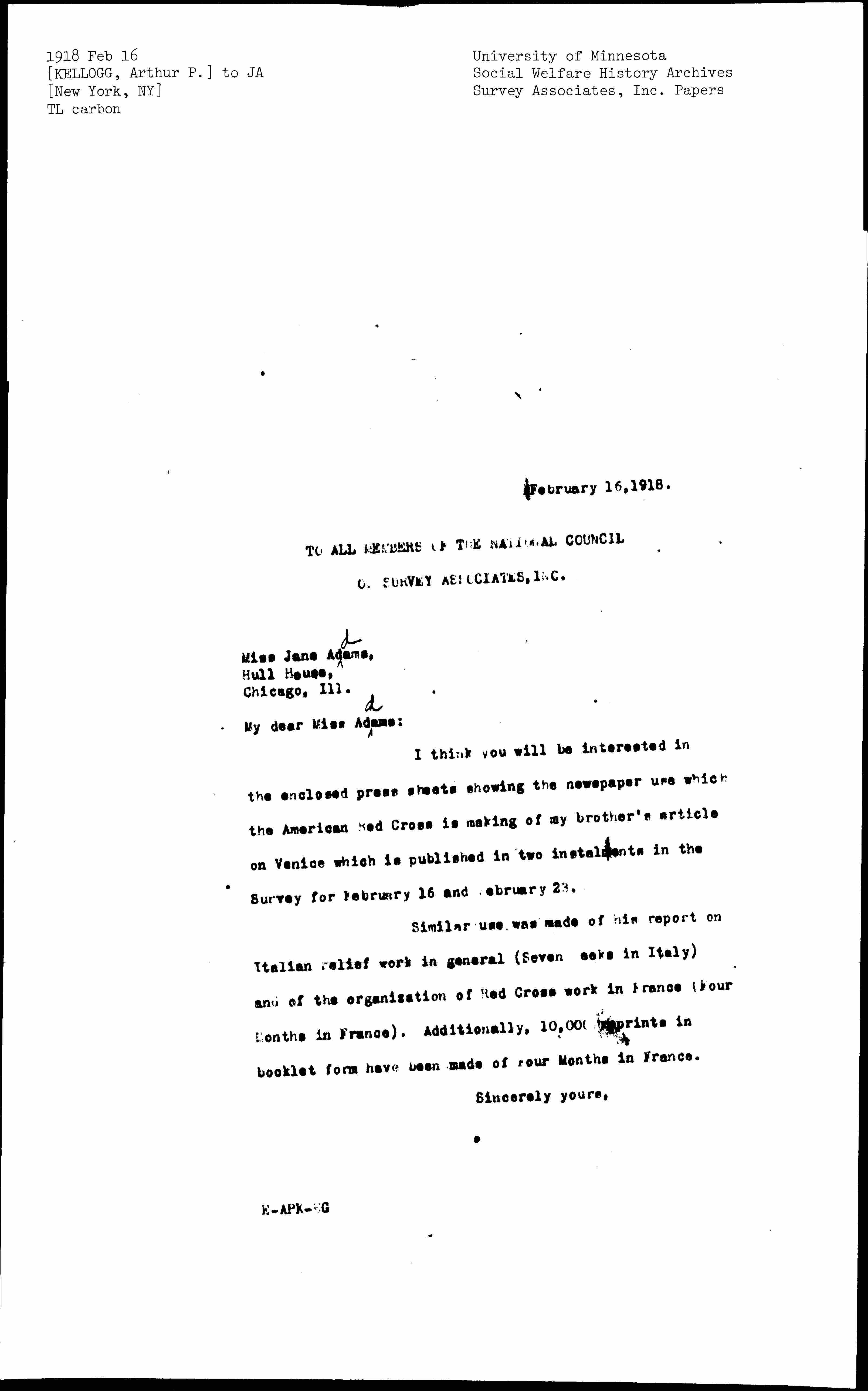 Similar use was made of his report on Italian relief work in general (Seven [Weeks] in Italy) and of the organization of Red Cross work in France (Four Months in France). Additionally, 10,000 [imprints] in booklet form have been made of Four Months in France.