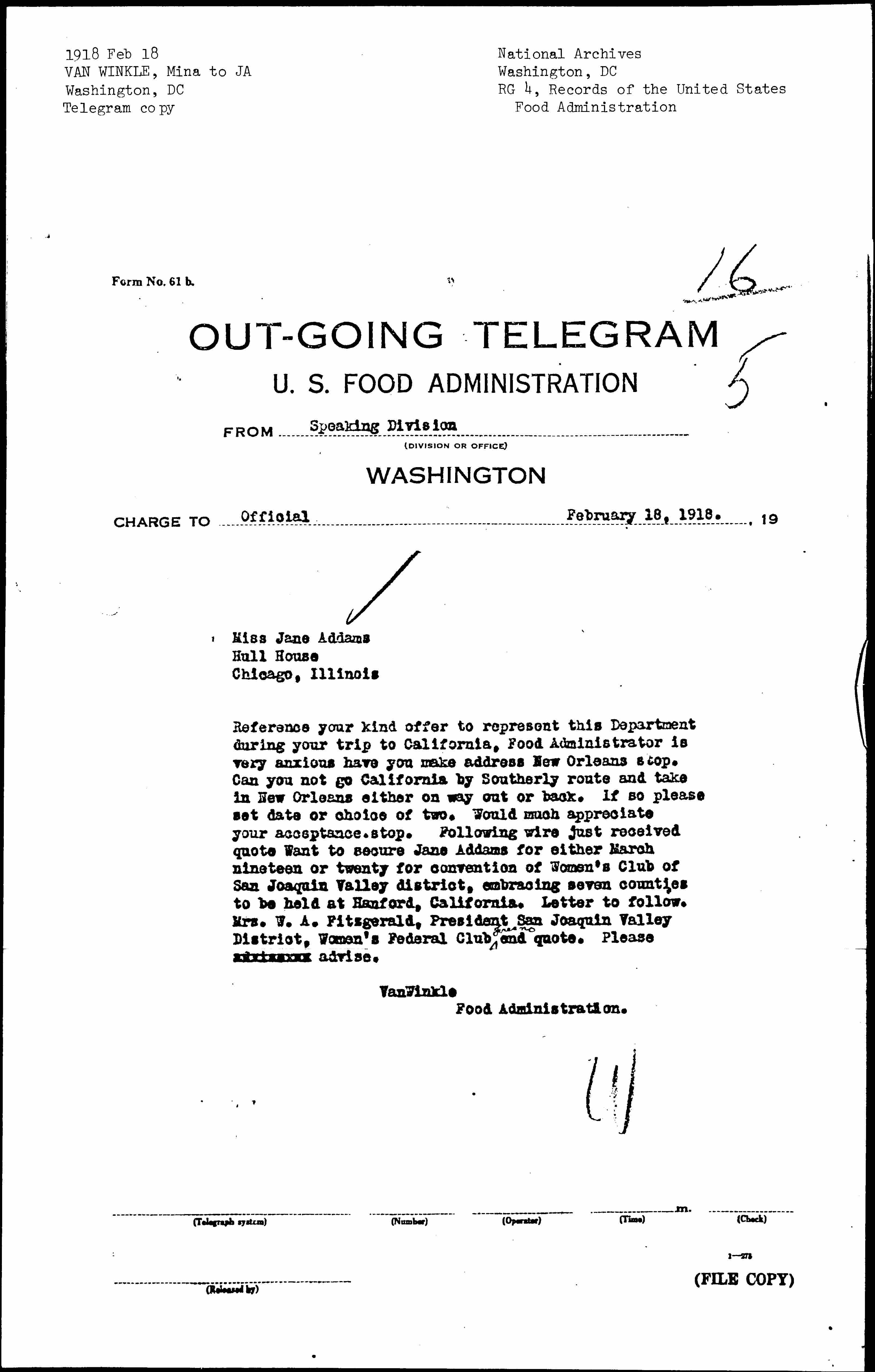 Reference your kind offer to represent this Department during your trip to California, Food Administrator is very anxious have you make address New Orleans. Can you not go California by Southerly route and take in New Orleans either on way out or back. If so please set date or choice of two. Would much appreciate your acceptance. Following wire just received "Want to secure Jane Addams for either March nineteen or twenty for convention of Women's Club of San Joaquin Valley district, embracing seven counties to be held at Hanford, California. Letter to follow. Mrs. W. A. Fitzgerald, President San Joaquin Valley District, Women's Federal Club ↑Fresno↓." Please [illegible] advise.